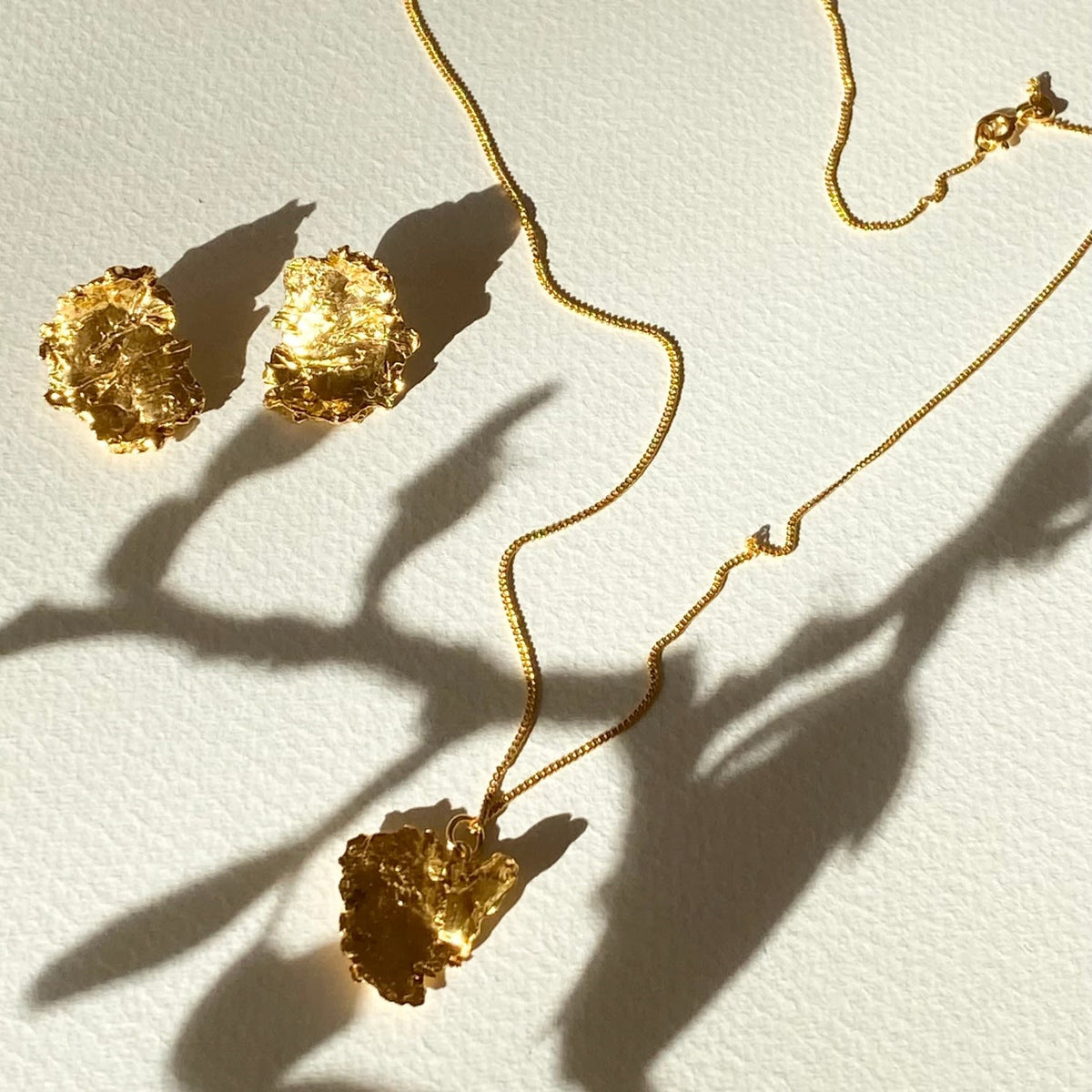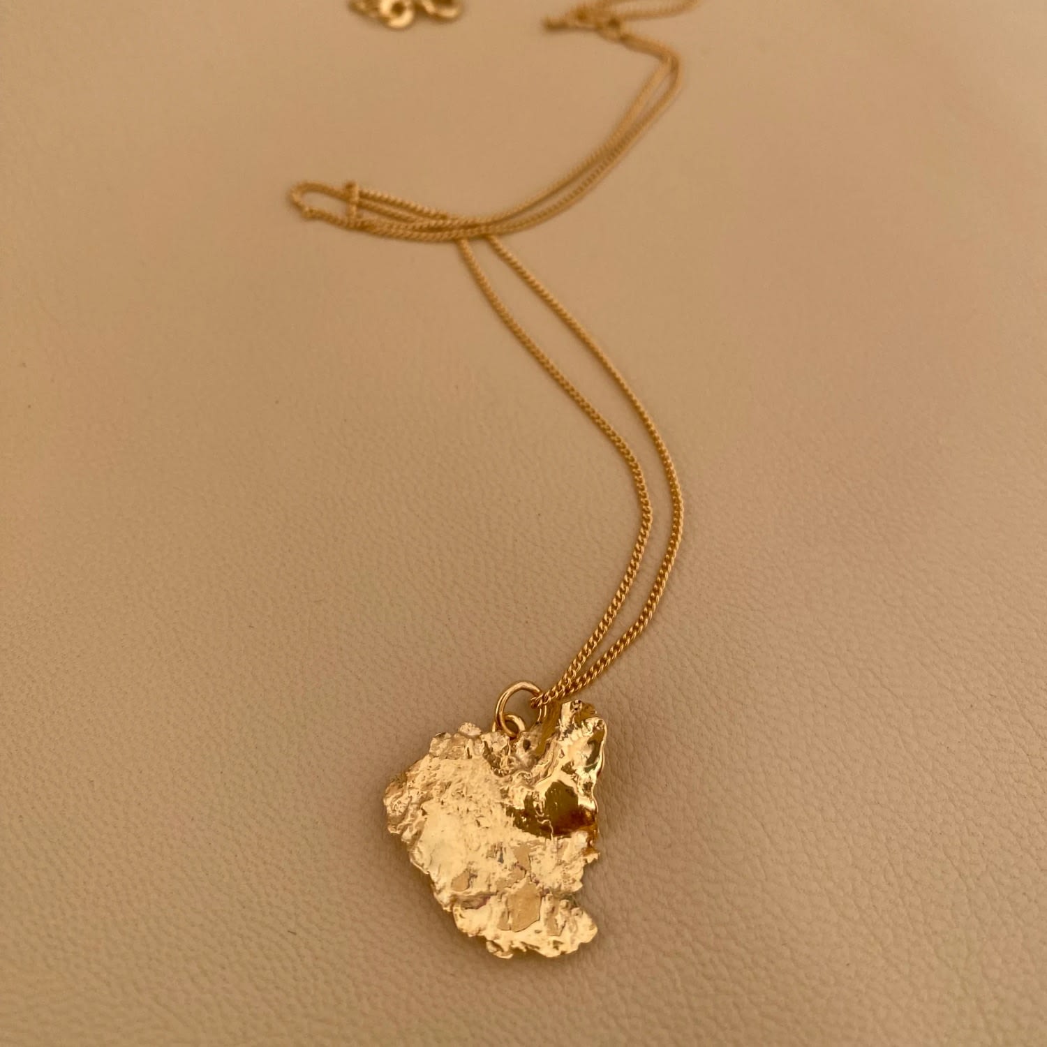 This handmade necklace is crafted from 24k gold-plated brass. To prevent scratches and protect the gold-plating, store it separately from other jewelry and clean it with a soft cloth or a special jewelry cleaning cloth.