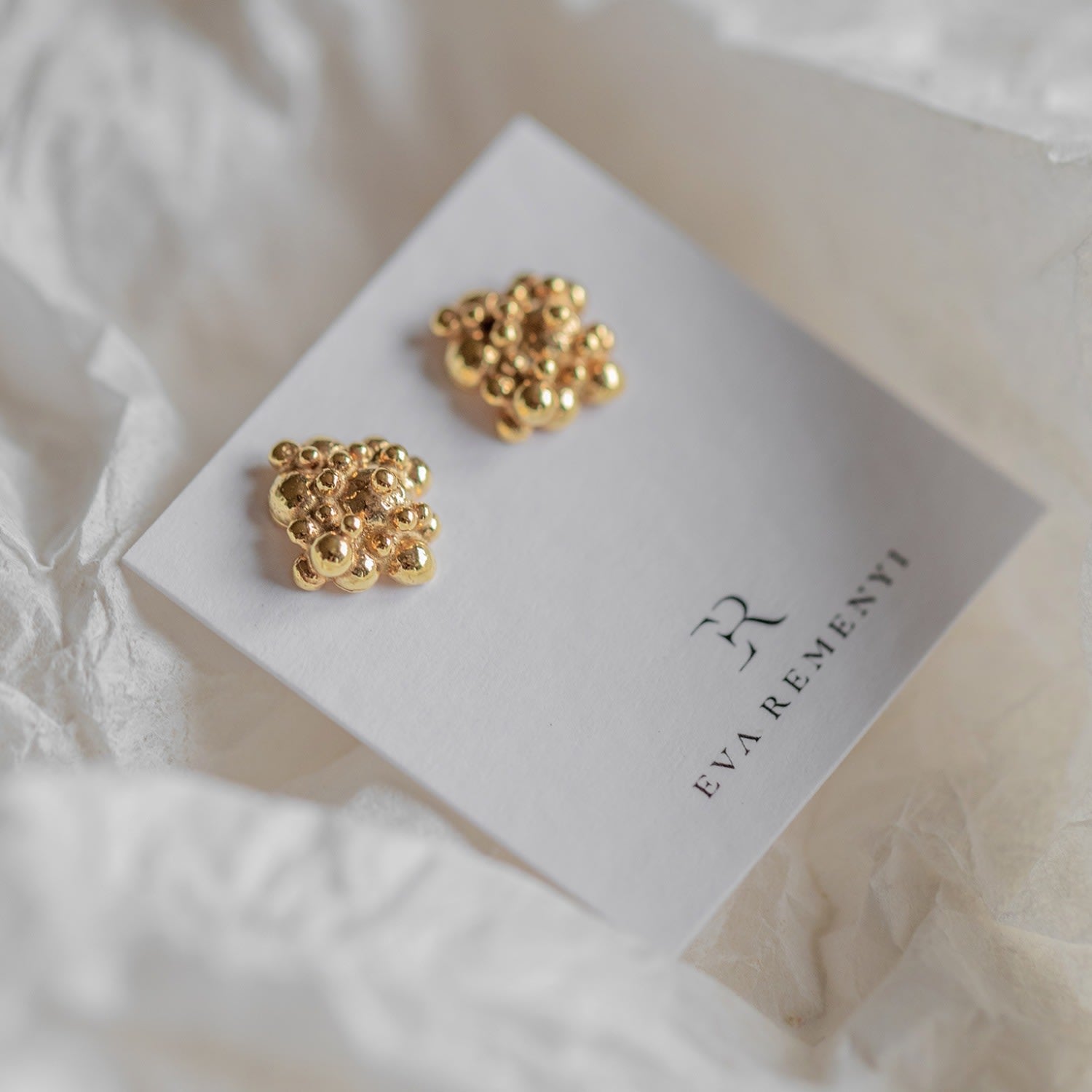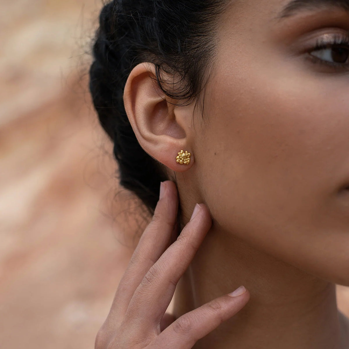 These handmade studs are crafted from 24ct gold-plated brass. To prevent scratches and protect the gold-plating, store them separately and clean with a soft cloth.