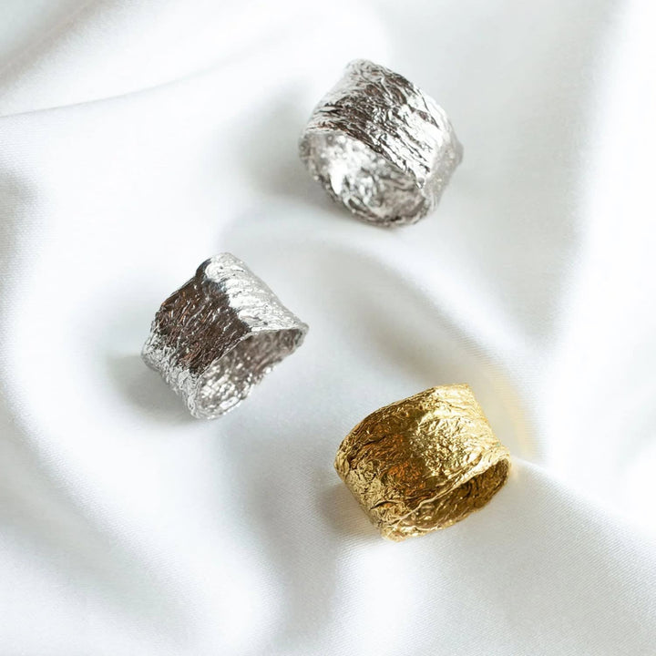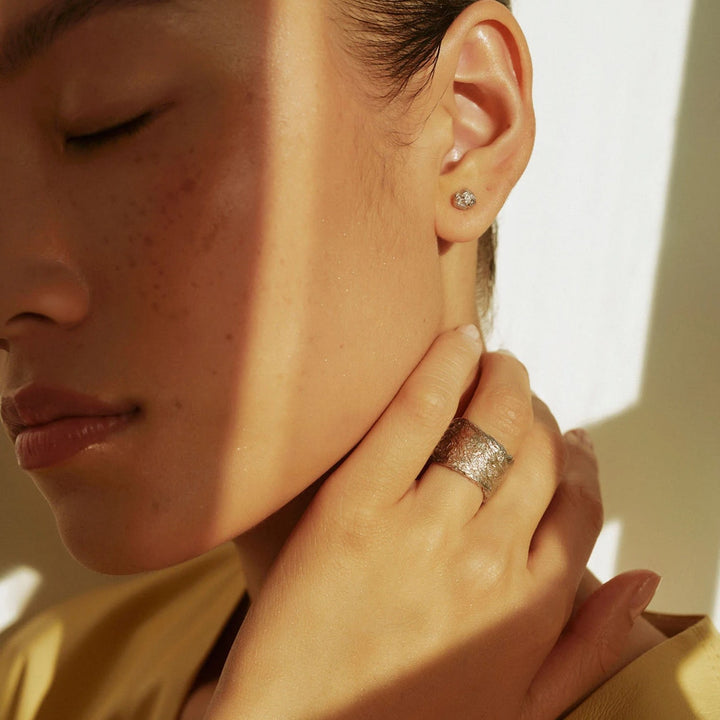 The Archaic Ring Silver by Eva Remenyi is an elegant and artistic accessory. This chunky band ring, which is from the Archaic collection, makes an elegant statement. The rhodium plated recycled silver band has an organic texture synonymous with the brand.