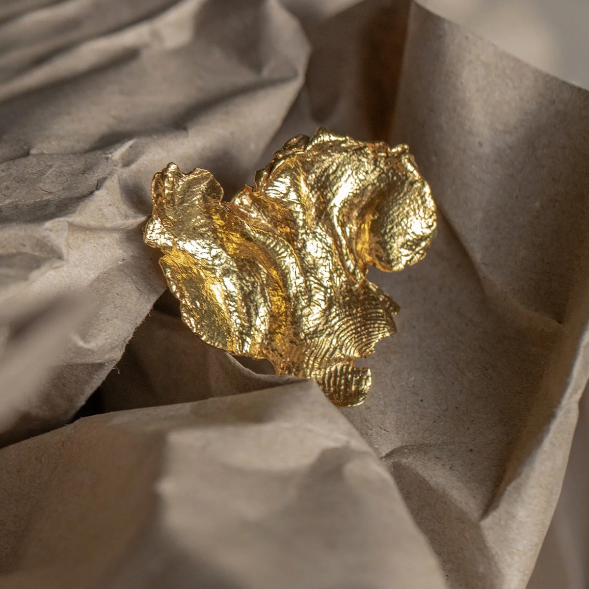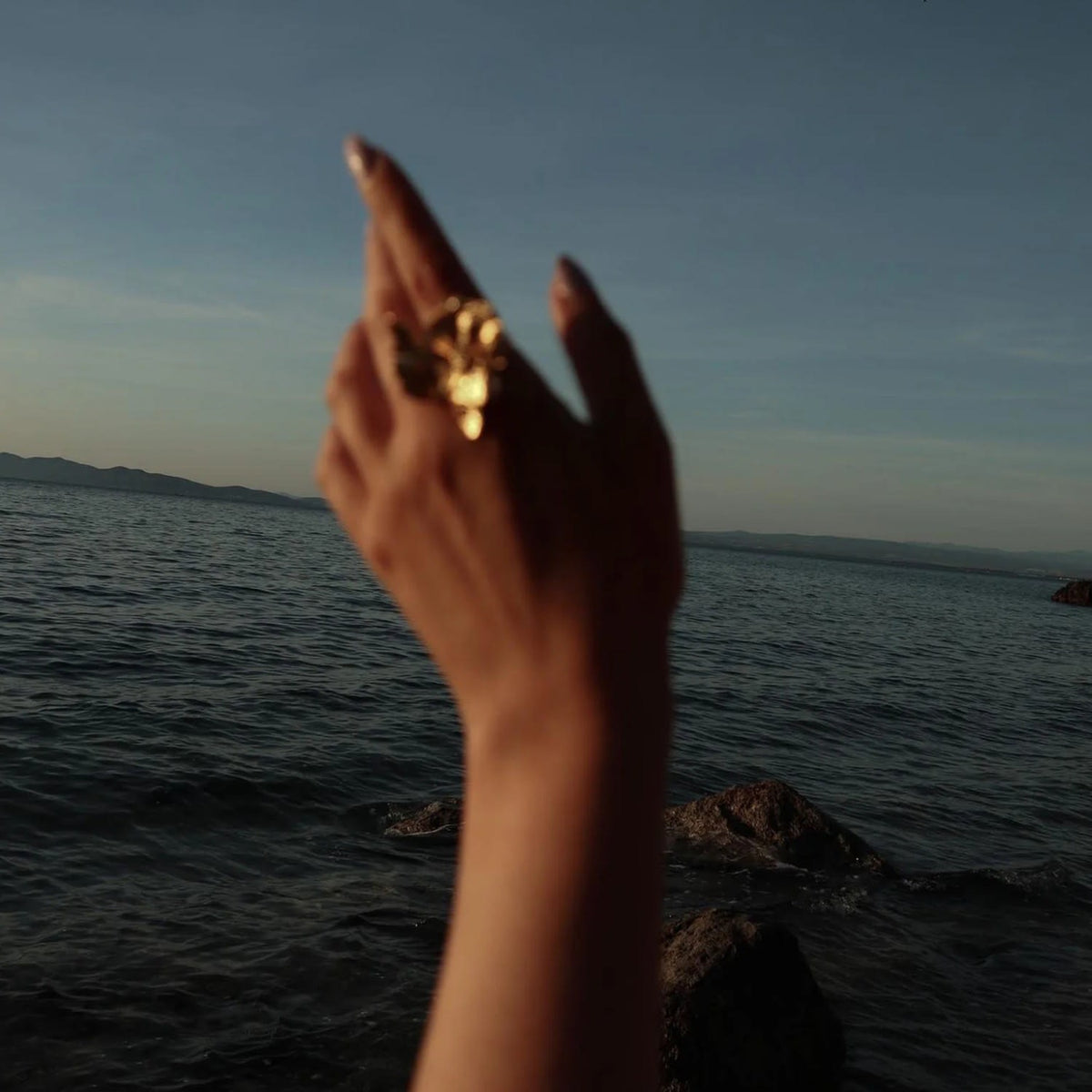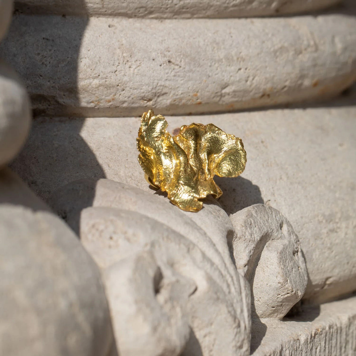 This Artemis Ring Gold by Eva Remenyi is a modern alternative to a classic cocktail ring. Its rippled form is reminiscent of waves in the sea, and the exaggerated shape is both elegant and dramatic. This ring is perfect for adding a touch of bold, artistic flair to your look, whether worn alone or as part of a set.