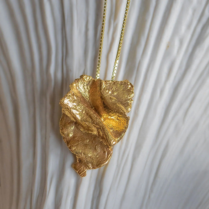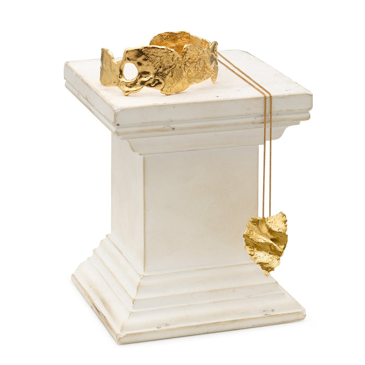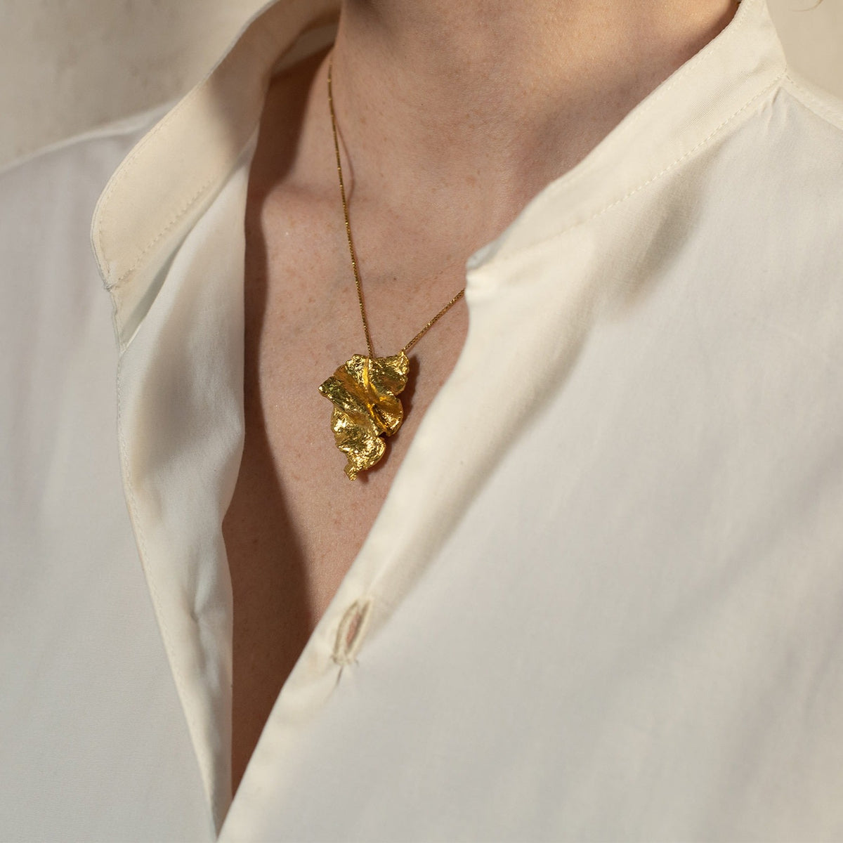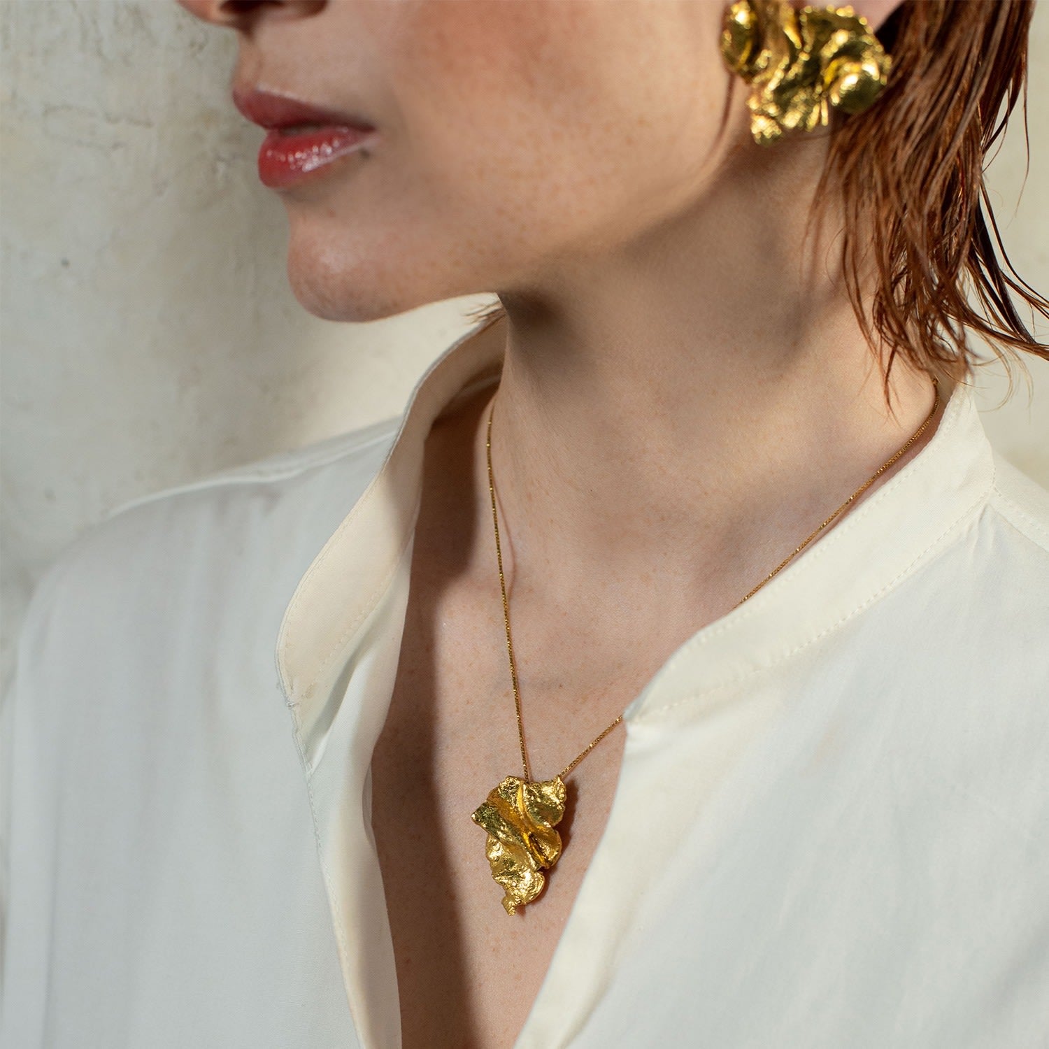 This Artemis Necklace Gold by Eva Remenyi is a beautiful and versatile piece that can be worn both day and night. It features a simple gold chain with a striking pendant with a rippled, organic surface reminiscent of ocean waves. This necklace looks beautiful on its own or layered with other pieces, making it a dramatic and elegant accessory.