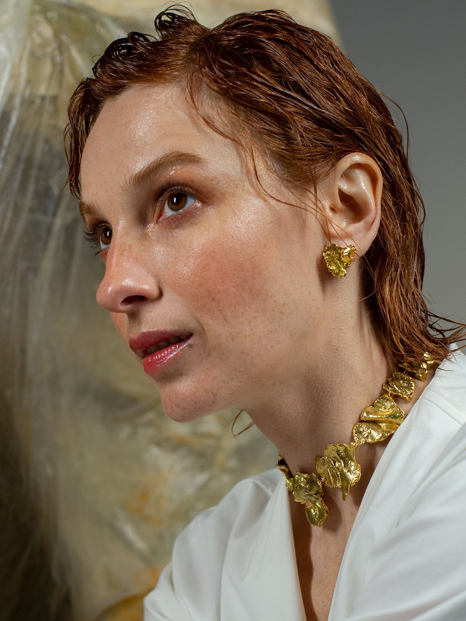These Artemis Earrings Gold by Eva Remenyi are an elevated pair of stud earrings. The organic, undulating surface of the 24k gold-plated brass gives them an elegant feel, and the exaggerated form means they work for both day and evening looks. They are a beautiful and versatile accessory that pairs perfectly with the matching choker.