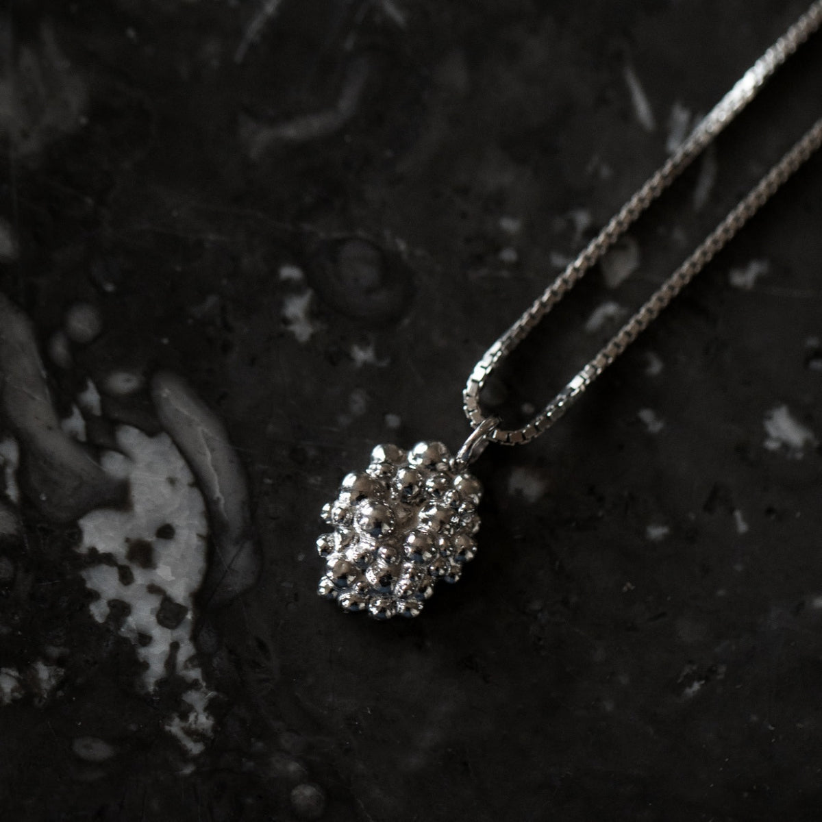 This necklace is made from rhodium-plated sterling silver and features an oval pendant with an organic, bubbled texture.