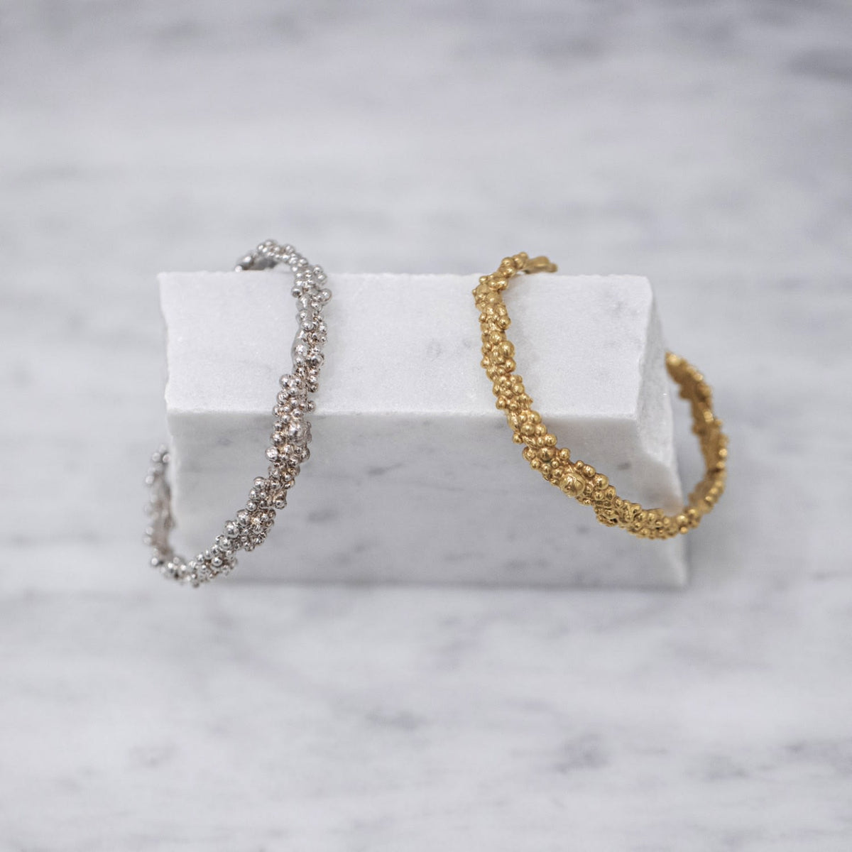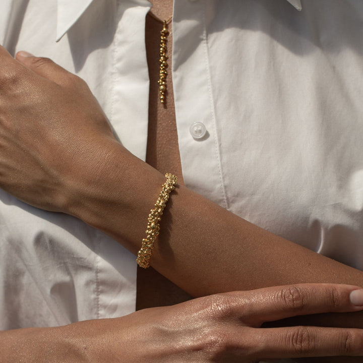 This tennis bracelet is made of 24ct gold-plated brass. It has a bubbled surface and a slightly adjustable opening.