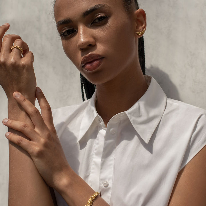 This Céleste Deux Bracelet Gold by Eva Remenyi is a deceptively simple and elegant piece. This tennis bracelet has a beautiful, bubbled surface and organic form. It is ideal for stacking with other bracelets and has a slightly adjustable opening for a comfortable fit.