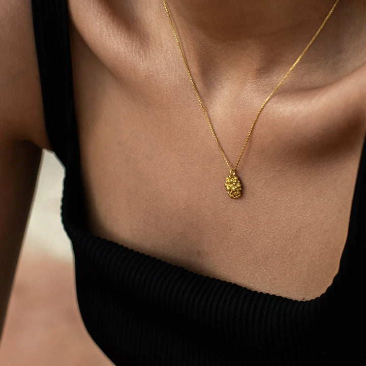 This pendant necklace is made with 24ct gold-plated brass and has an oval pendant with an organic, bubbled texture. It is made with the lost-wax technique.