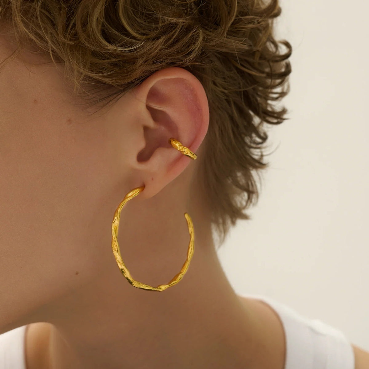 These hoop earrings are made of 24ct gold-plated brass and have a surface that evokes a lunar landscape. They are also available in silver.