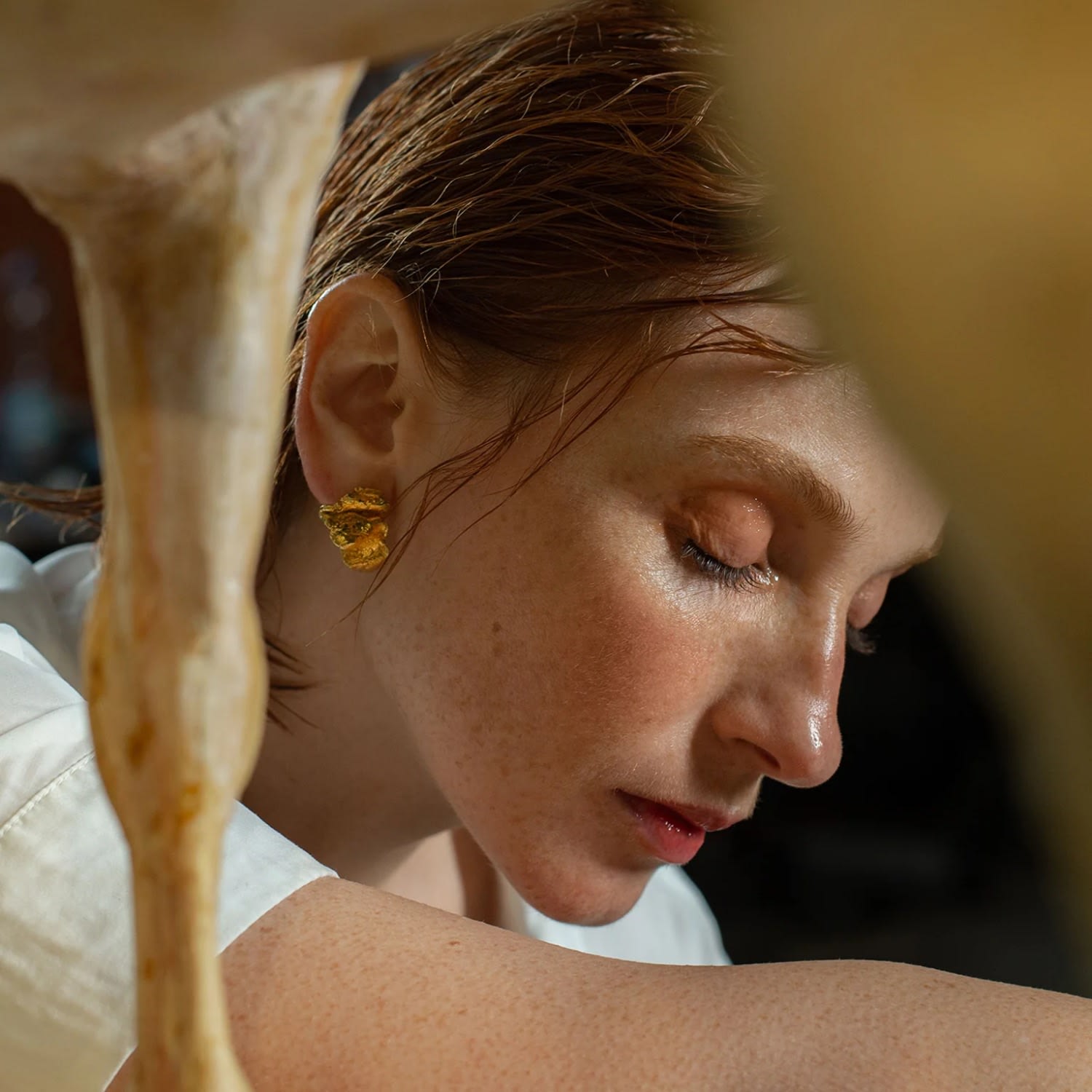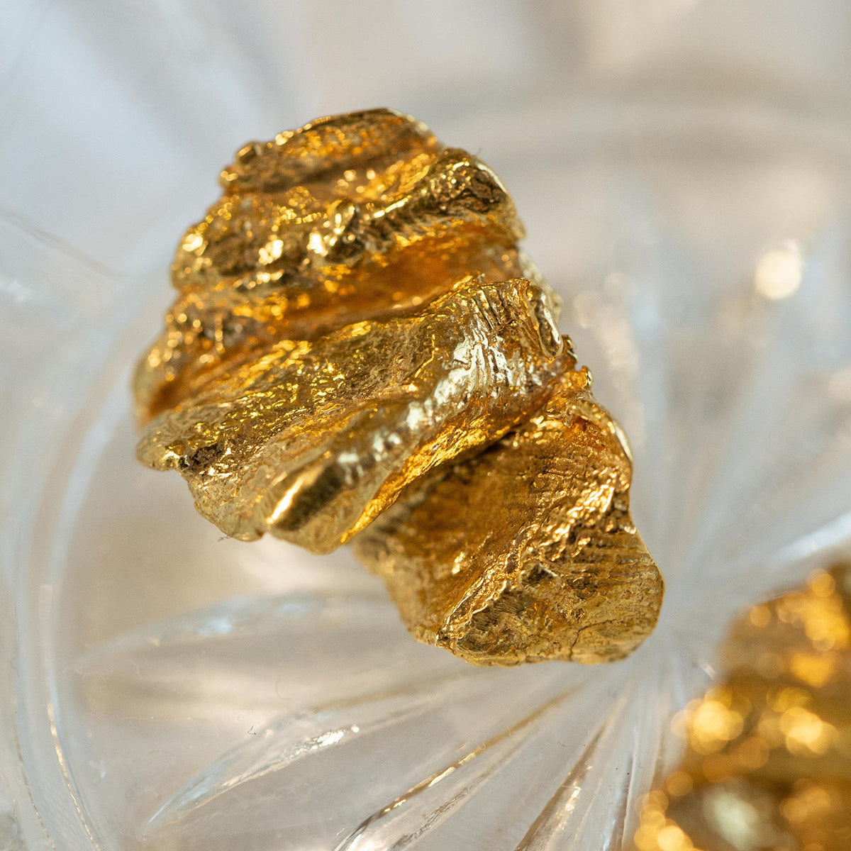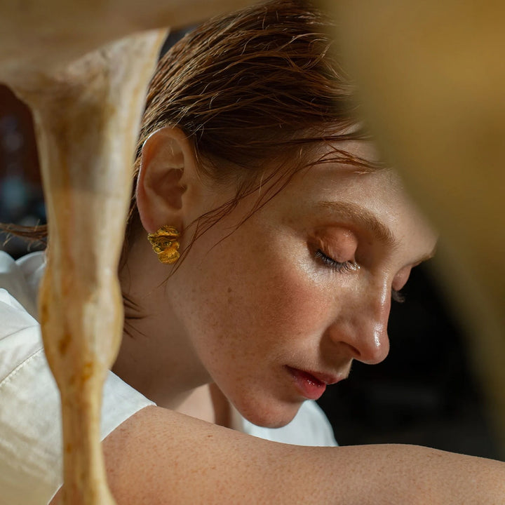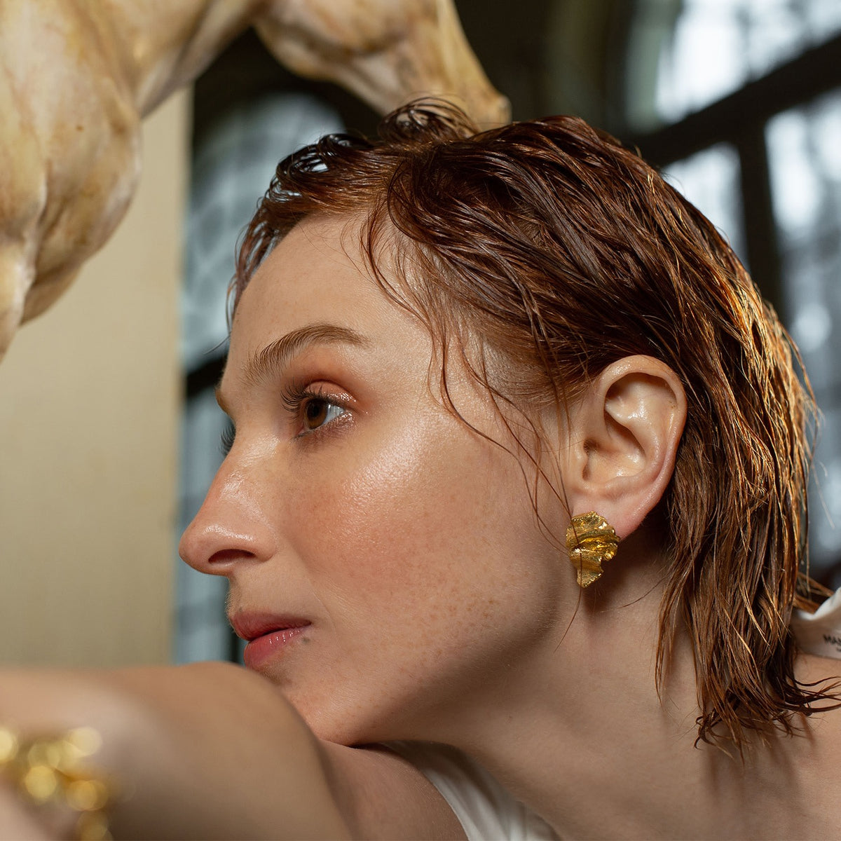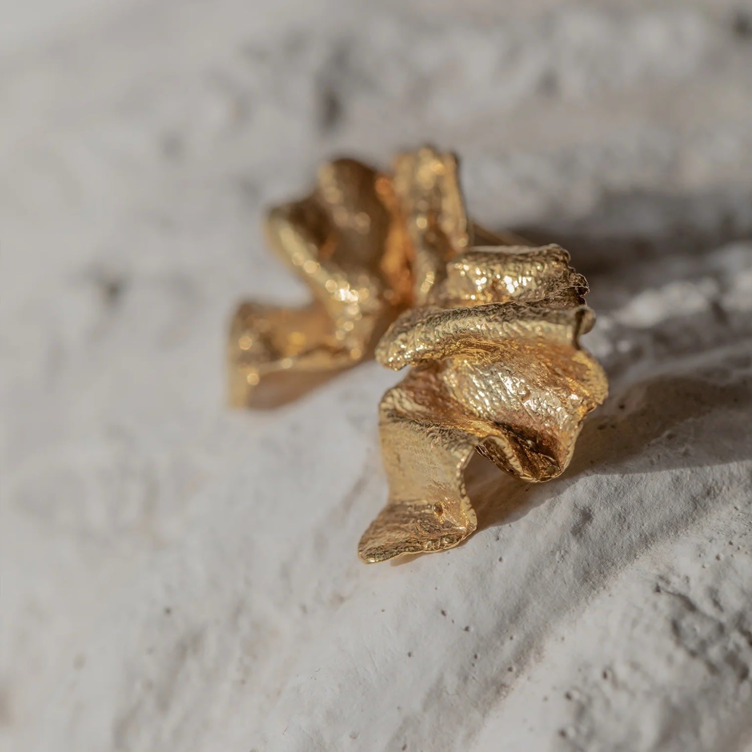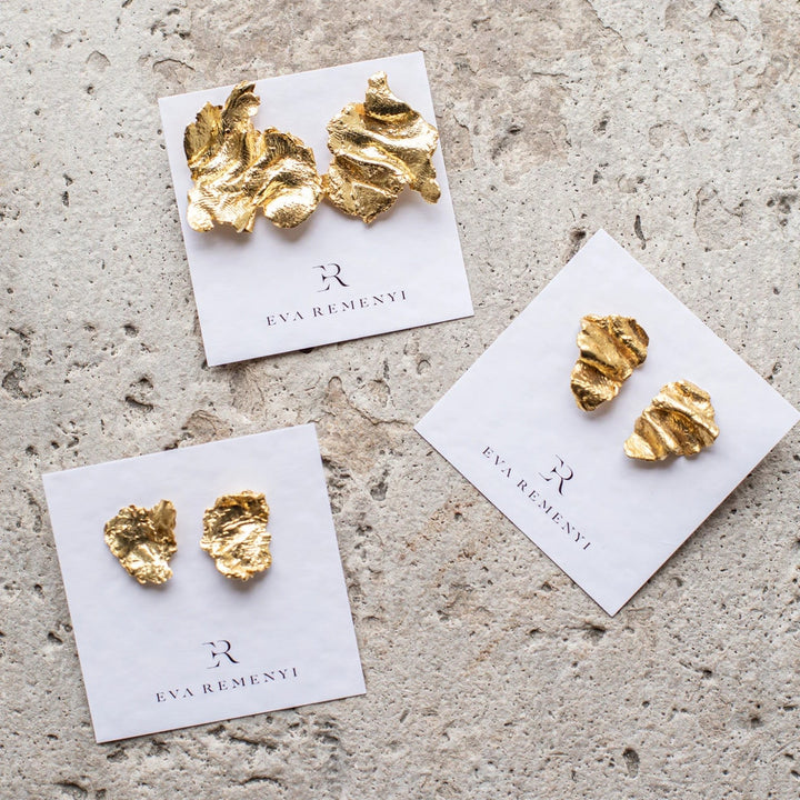 These Artemis Wave Earrings Gold by Eva Remenyi are a beautiful pair of stud earrings reminiscent of the sea. They have a wave-like design with folds and texture, giving them movement and elegance. Made of 24k gold-plated brass, they are simple enough for everyday wear while also making a subtle statement.