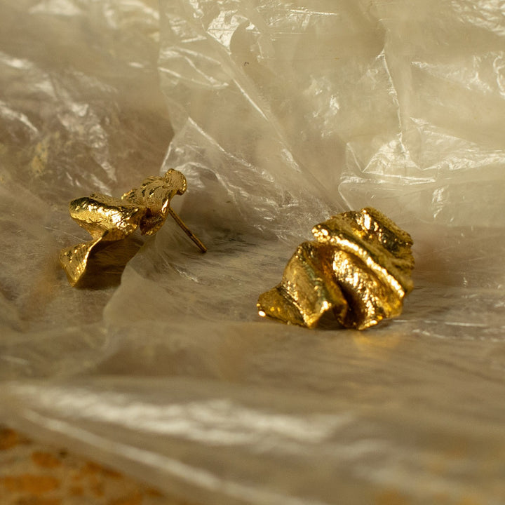 These stud earrings are made of 24k gold-plated brass and have a wave-like design. They are also available in silver.