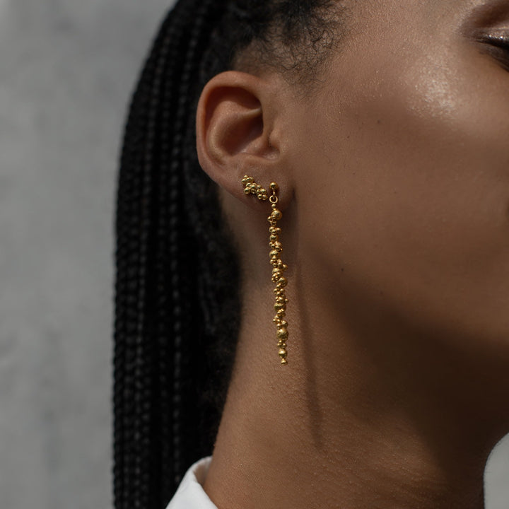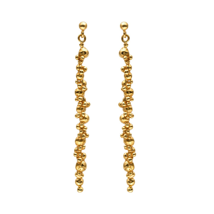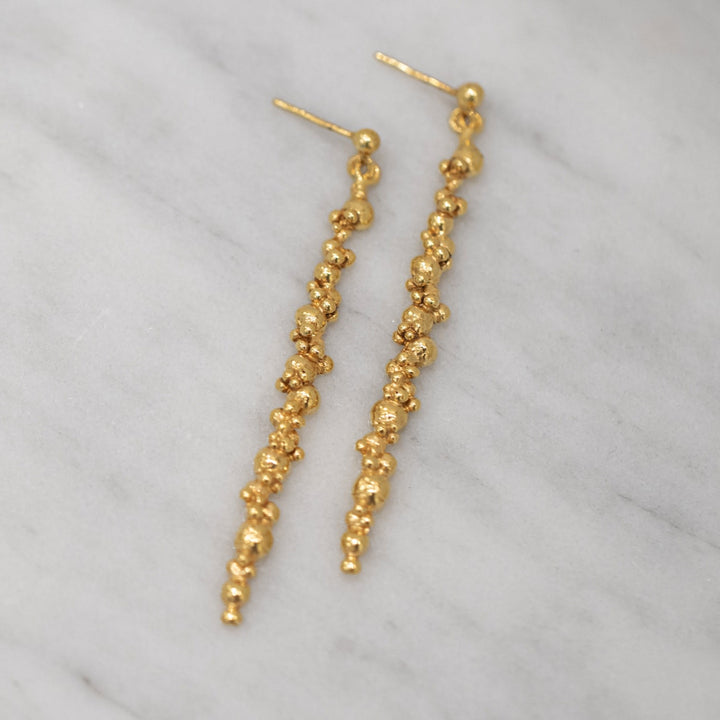 These dangle earrings are made of 24ct gold plated brass. They have a bubbled surface and a long drop shape. They are also available in silver.