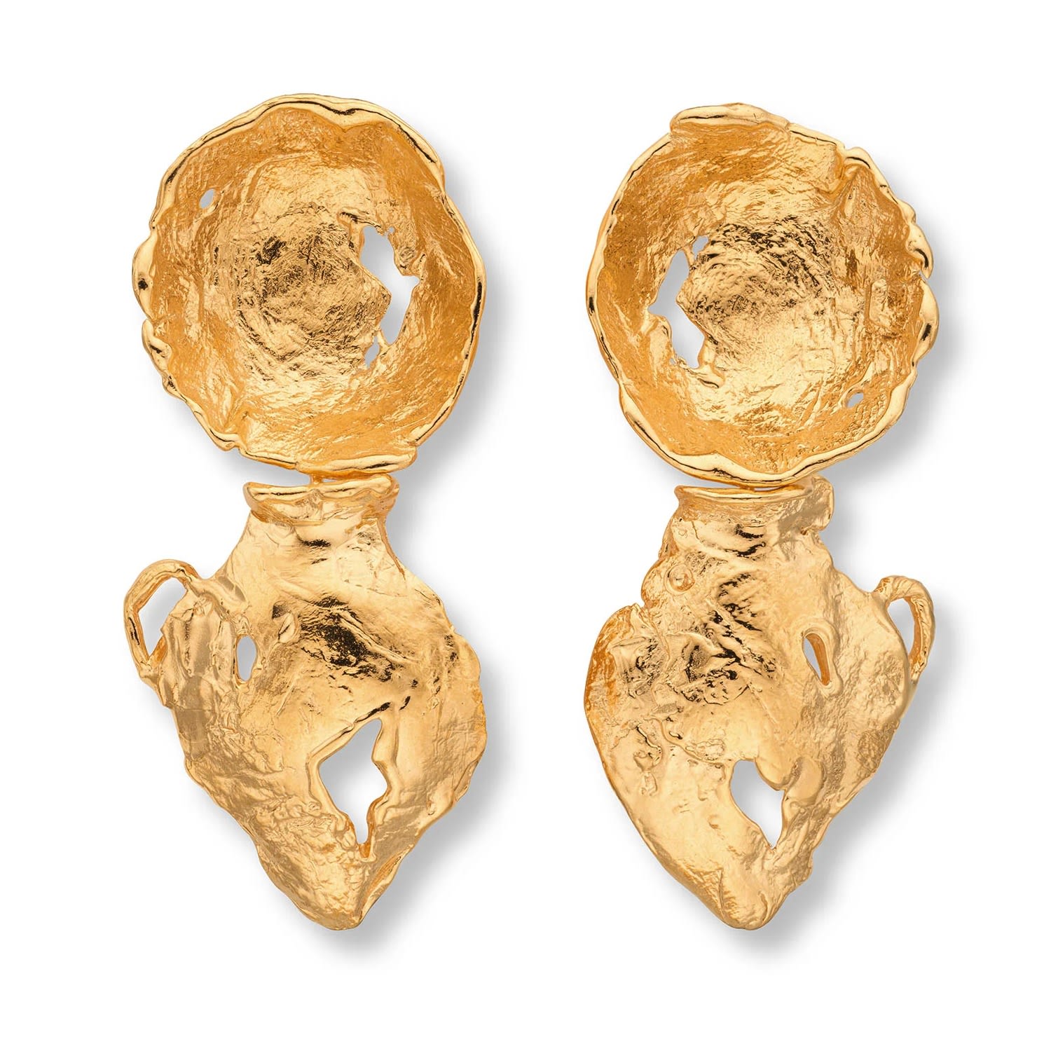 These Vacation Ika Earrings Gold by Eva Remenyi are a beautiful pair of dangle earrings that evoke a sense of a sun-kissed holiday. They are inspired by a weathered amphora and are made of 24k gold-plated brass. Their long shape is elegant and modern, while the bubbled surface adds softness and interest.