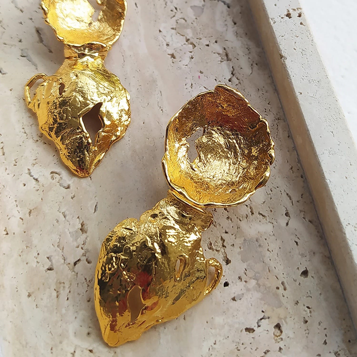 These dangle earrings are made of 24k gold-plated brass and have a long, bubbled shape. They are also available in silver.