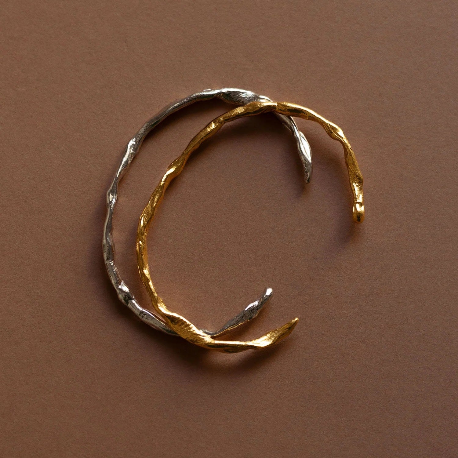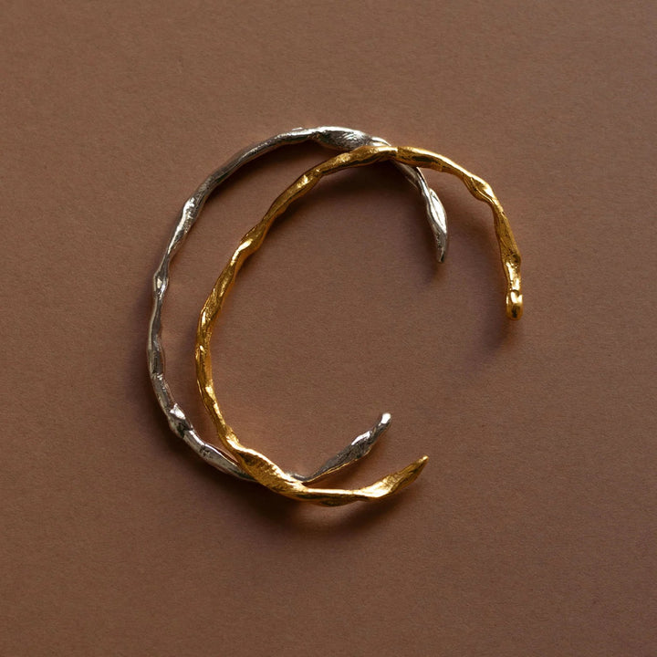 This cuff bracelet is made from 1 micron 24 karat gold-plated brass. It is also available in silver and 14 karat gold, and is nickel-free.