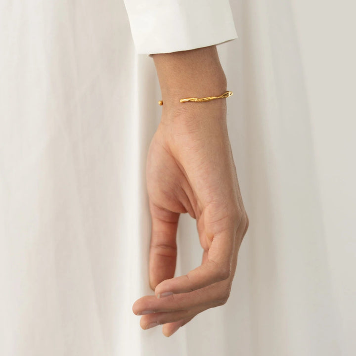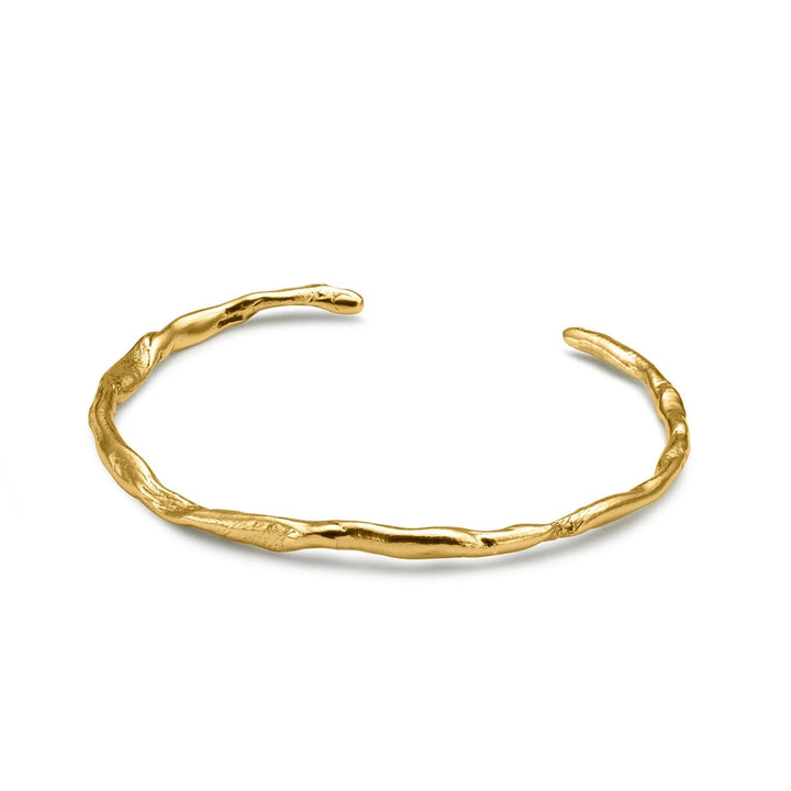 This Talisman Bracelet Gold by Eva Remenyi is a timeless piece of elegance. This cuff bracelet has a sleek, classic design and a unique textured surface. It's made from 24 karat gold-plated brass and is a beautiful piece to add a touch of grace to any outfit.