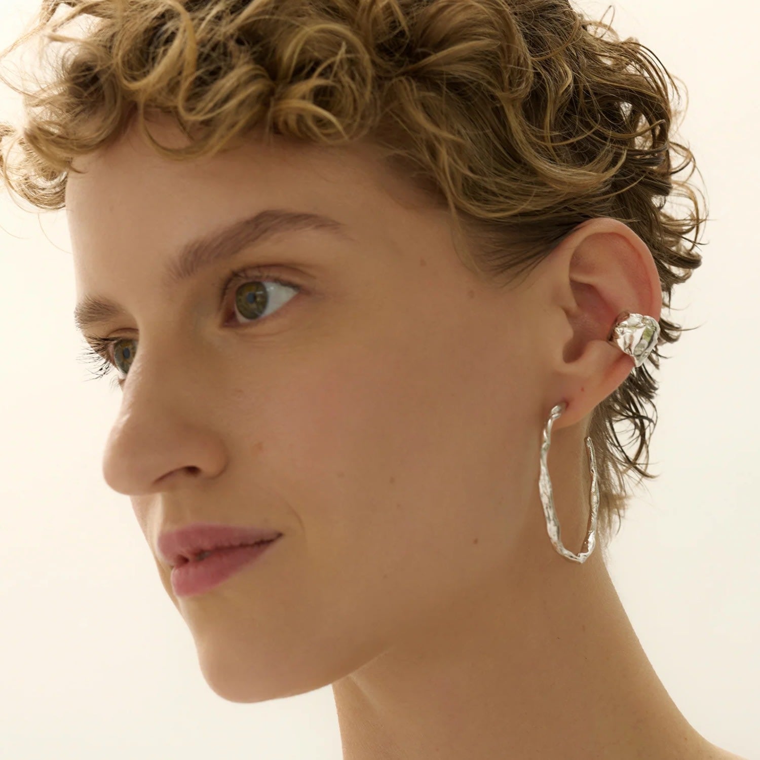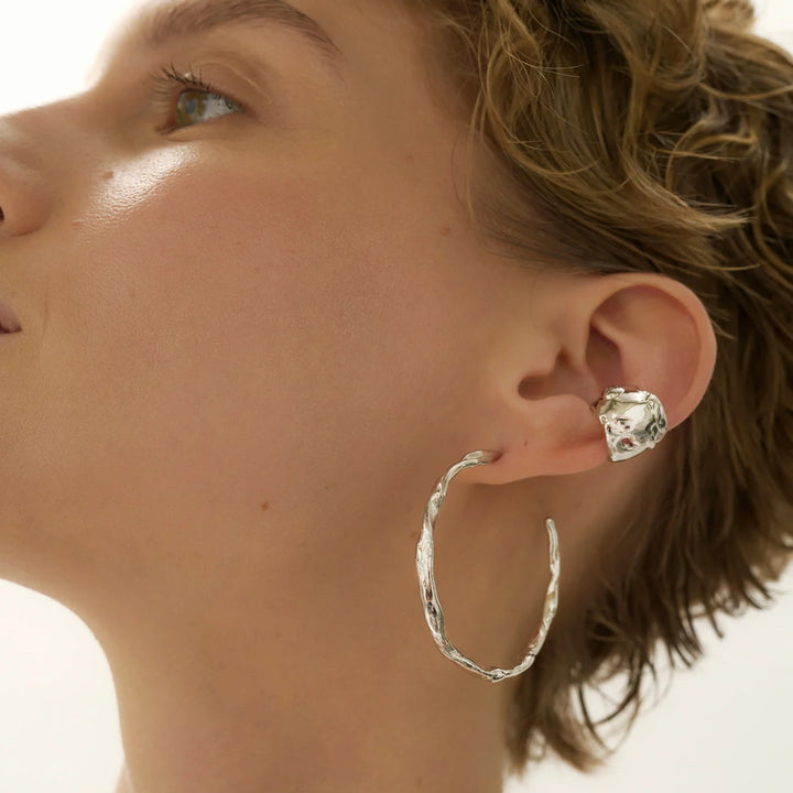 These hoop earrings are made of rhodium-plated sterling silver and have a textured surface that evokes a lunar landscape. They are also available in gold.