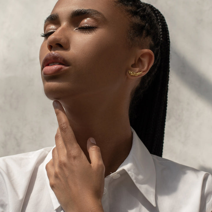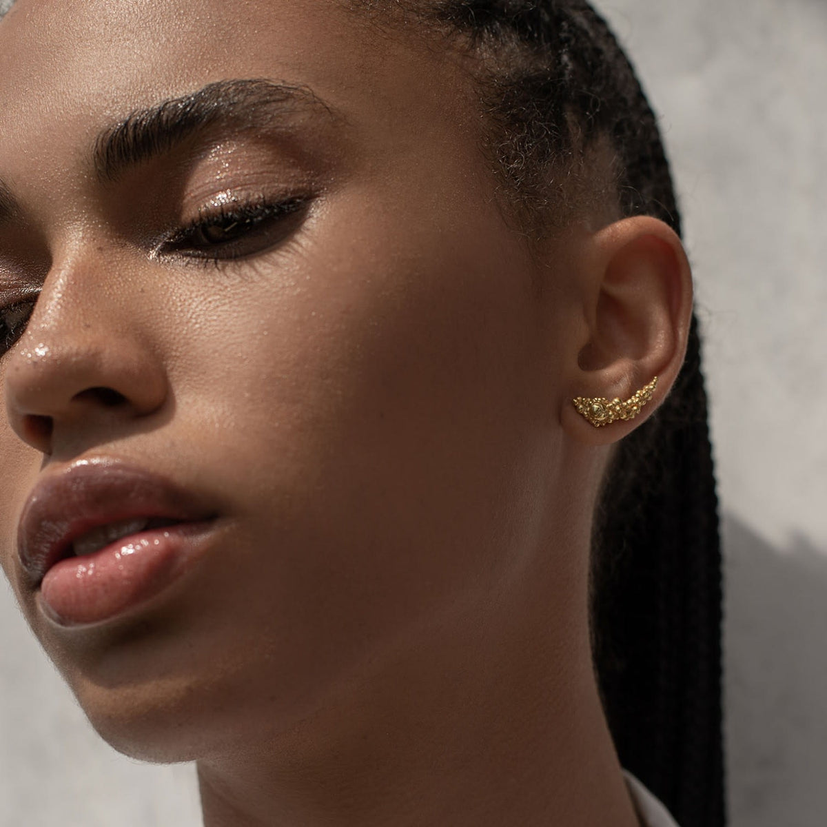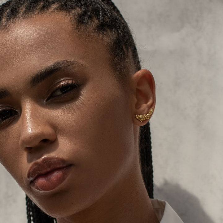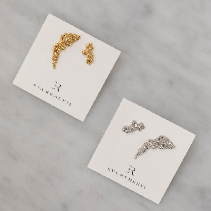 These Céleste Deux Asymmetrical Stud Earrings Gold by Eva Remenyi are a unique pair of stud earrings. They have a soft bubbled surface and an organic form that hugs the shape of the ear. The mismatching shapes are made of 24ct gold-plated brass and can be worn separately or together to create interesting combinations.