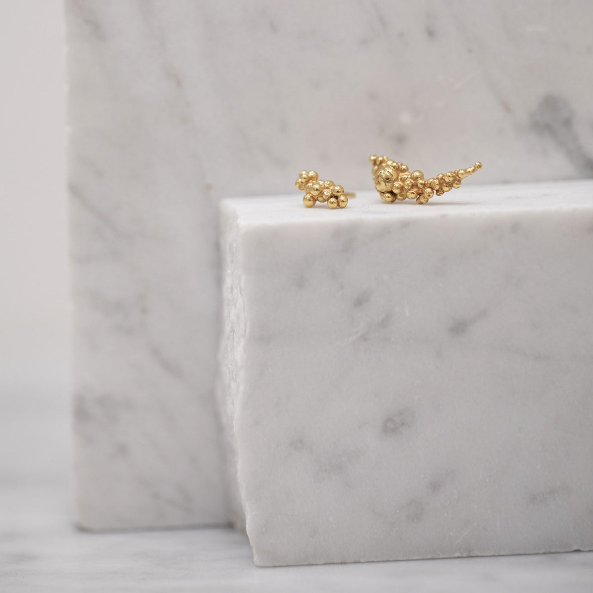 These stud earrings are made of 24ct gold-plated brass. They have mismatching, asymmetrical shapes and a soft, bubbled surface.