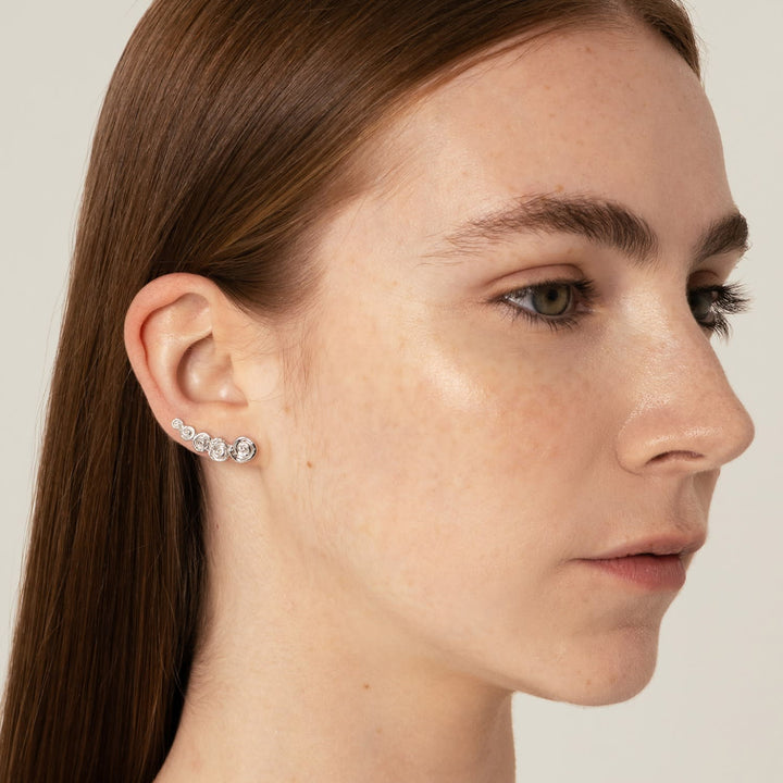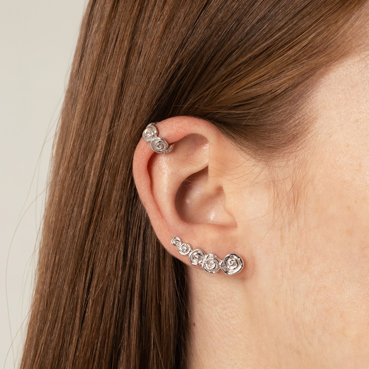 This Origin Ear Climber Silver by Eva Remenyi is a sophisticated ear climber with a timeless spiral motif. It is crafted to perfectly follow the natural curve of the ear and is made from rhodium-plated recycled sterling silver. This playful yet sophisticated piece is perfect for wearing on its own or stacking with other ear cuffs.
