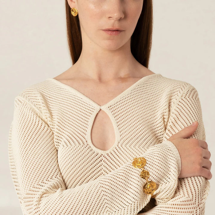 This Origin Bracelet Gold by Eva Remenyi embodies the essence of femininity that is both soft and strong. The rhythm of the smaller and larger elements evokes the movements of folk dance and the shape of twirling skirts. Wearing this bracelet is a reminder of your roots and a guide to rediscover the strength within you.