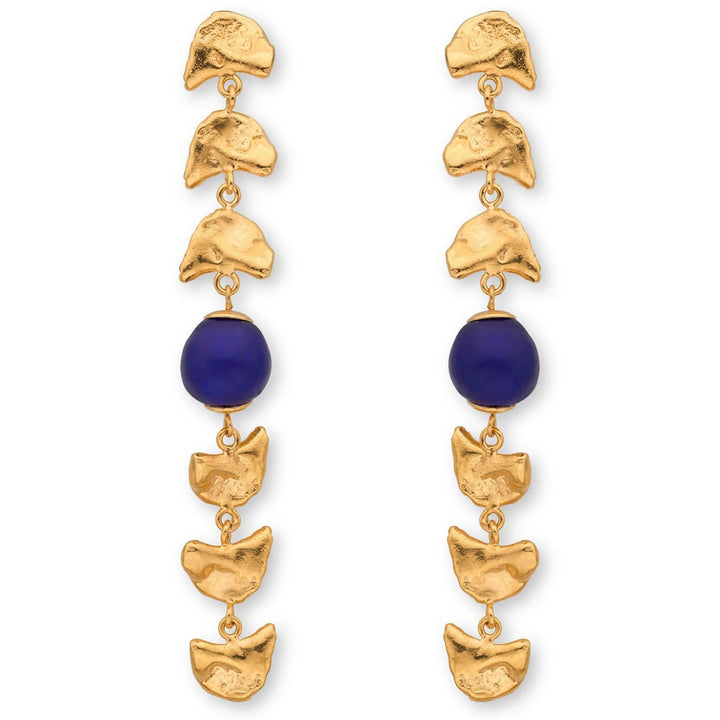 These Vacation Sunset Earrings Gold by Eva Remenyi capture the enchanting charm of a summer getaway. They feature irregular, organic shapes and a deep blue upcycled glass bead, embodying timeless elegance. These earrings are the perfect accessory for a summer evening, symbolizing a connection to nature and a love for travel.