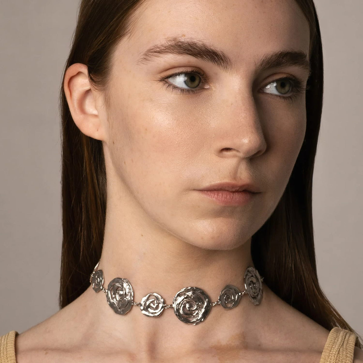 This choker is handcrafted from recycled sterling silver with rhodium plating and is nickel-free.