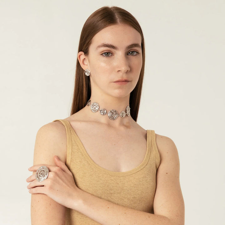 This Origin Choker Silver by Eva Remenyi embodies a femininity that is both soft and strong. The rhythm of the smaller and larger elements evokes the movement of folk dance, and it gently embraces the neck. It's a statement piece that can be worn on its own or as a beautiful set with the collection's earrings.