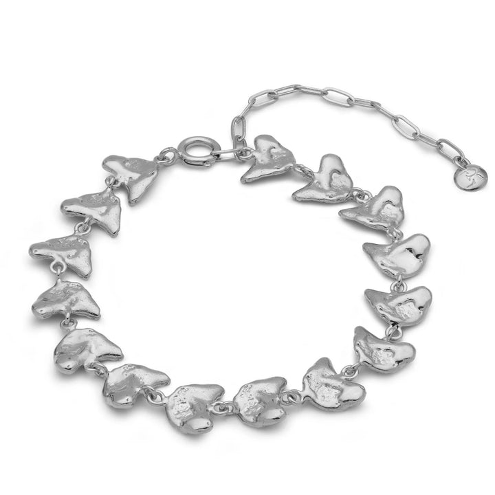 This bracelet is handcrafted from rhodium-plated recycled silver and features irregular, organic shapes. The size is adjustable.