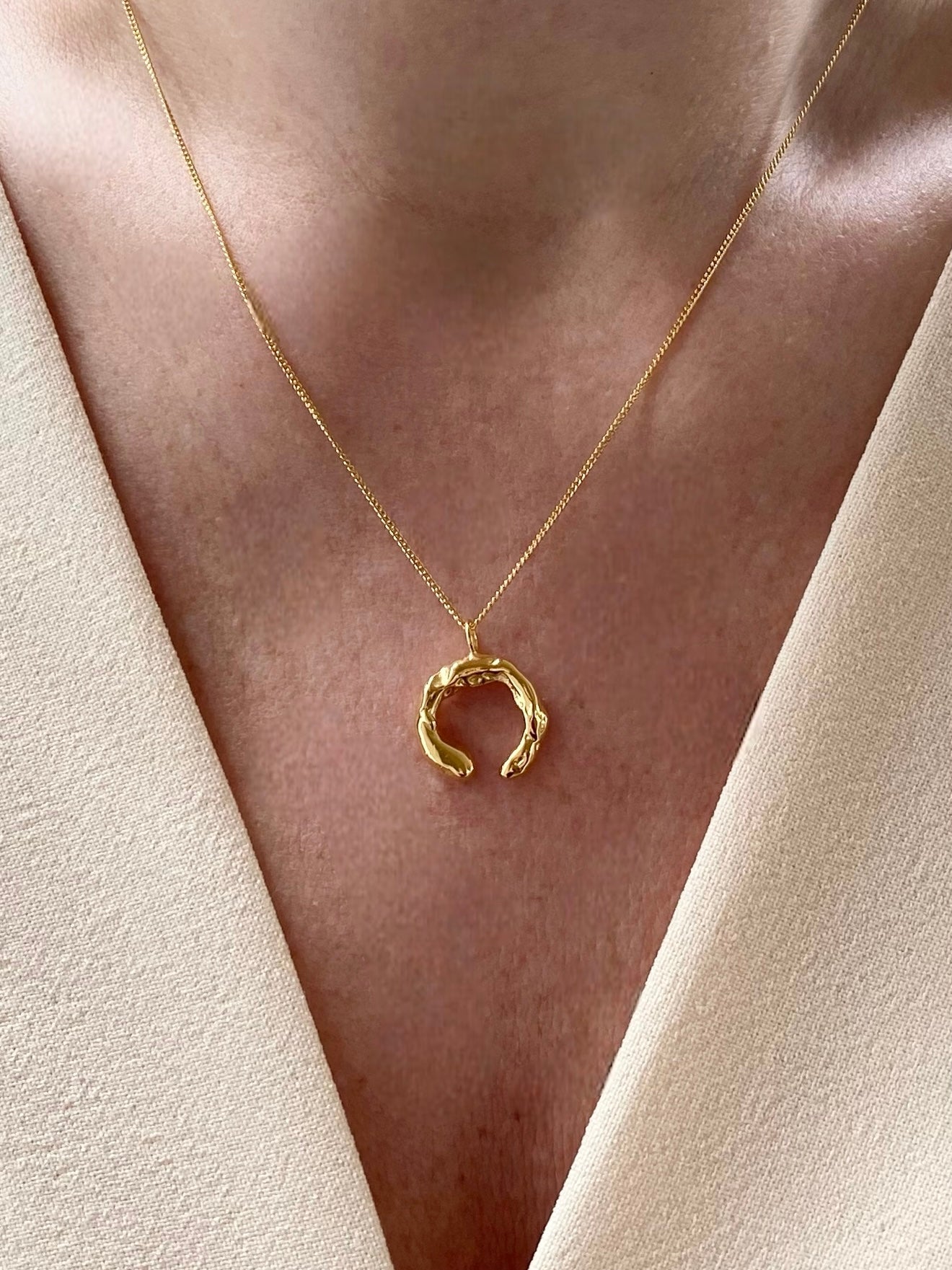This Talisman Fortune Necklace Gold by Eva Remenyi is a perfect everyday piece that carries a unique essence of protection and good fortune. Made from 24-karat gold-plated brass, its surface evokes the feeling of a lunar landscape. This necklace is a beautiful and meaningful addition to any collection.