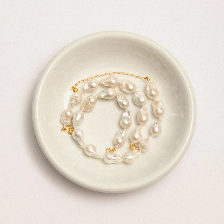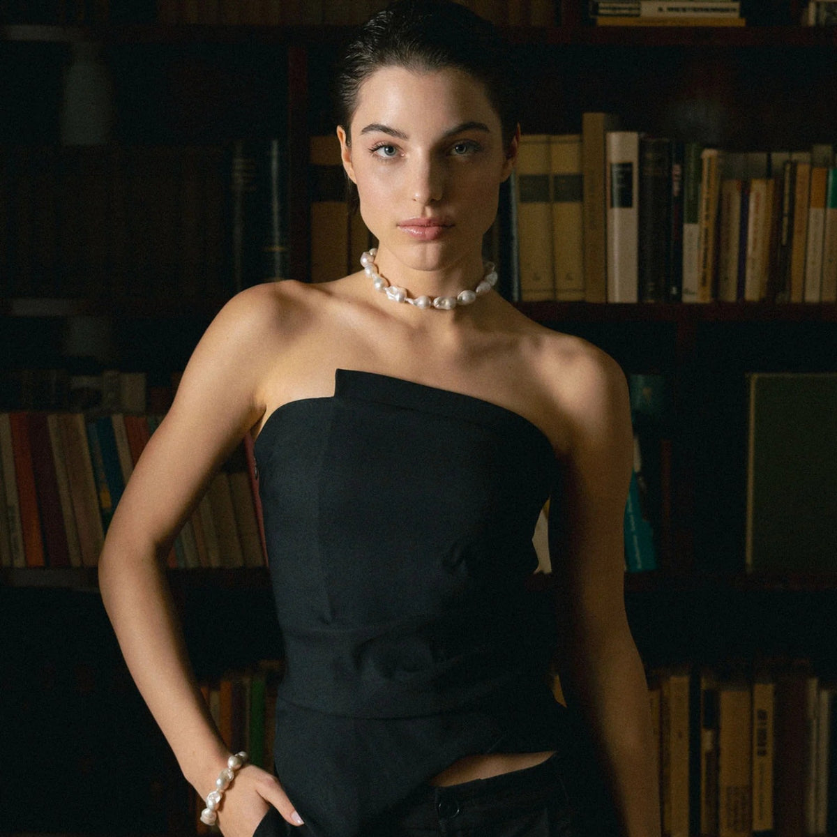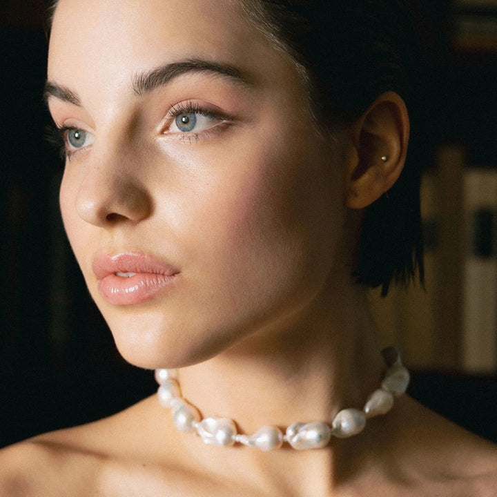 The Baroque Pearl Choker by Eva Remenyi is a striking and unique accessory. It features irregular freshwater pearls and is plated with 1-micron 24-karat gold. It enhances any look and is perfect for a festive occasion when paired with the matching bracelet.