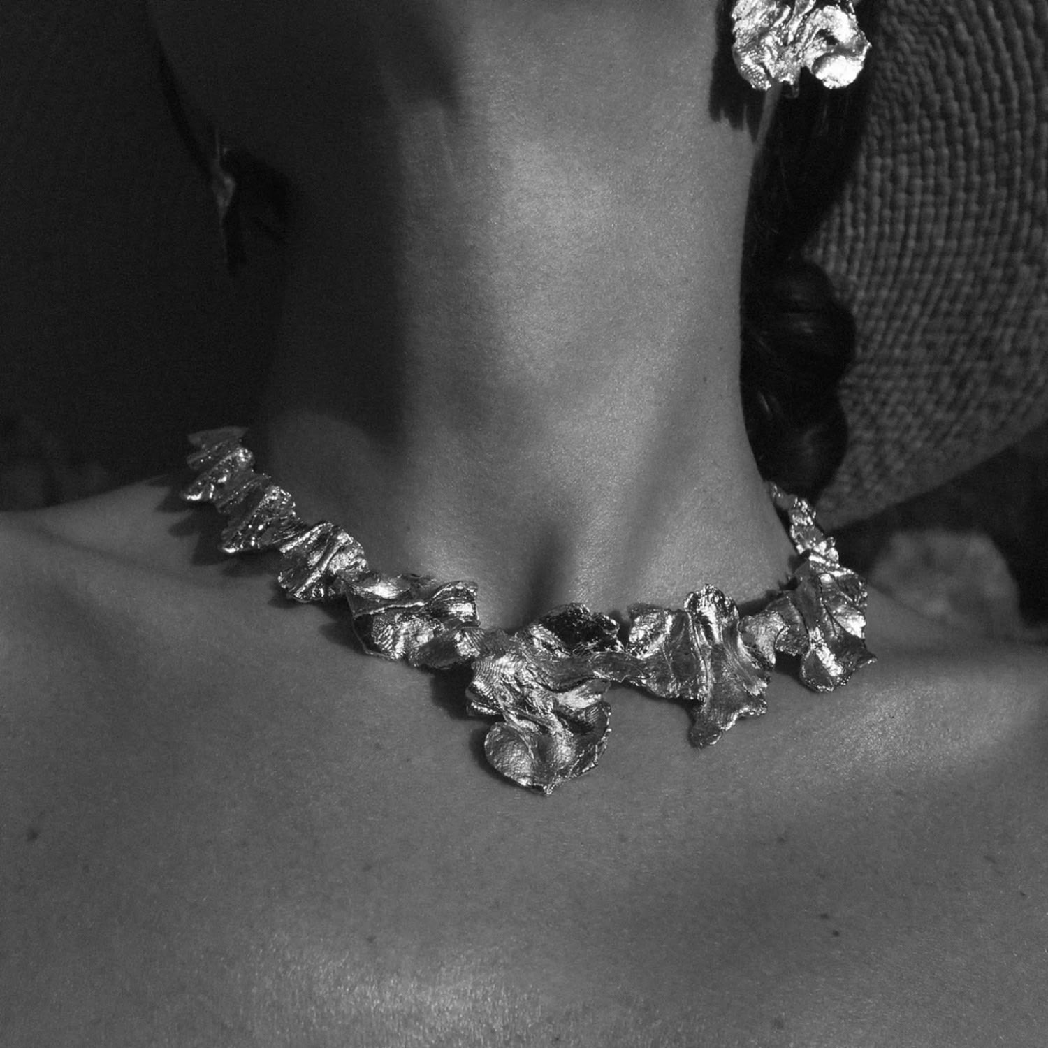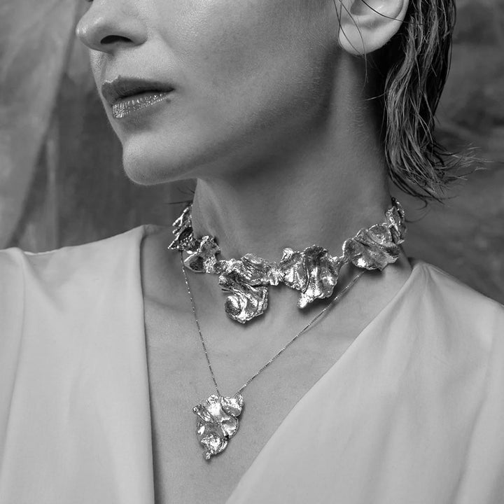 The Artemis Choker Silver by Eva Remenyi is a real statement piece that adds drama to any outfit. The undulating surface is reminiscent of ripples in the sea, and the exaggerated form is both bold and delicate. This recycled silver necklace has an extendable chain clasp and can be layered with other necklaces for a modern look.