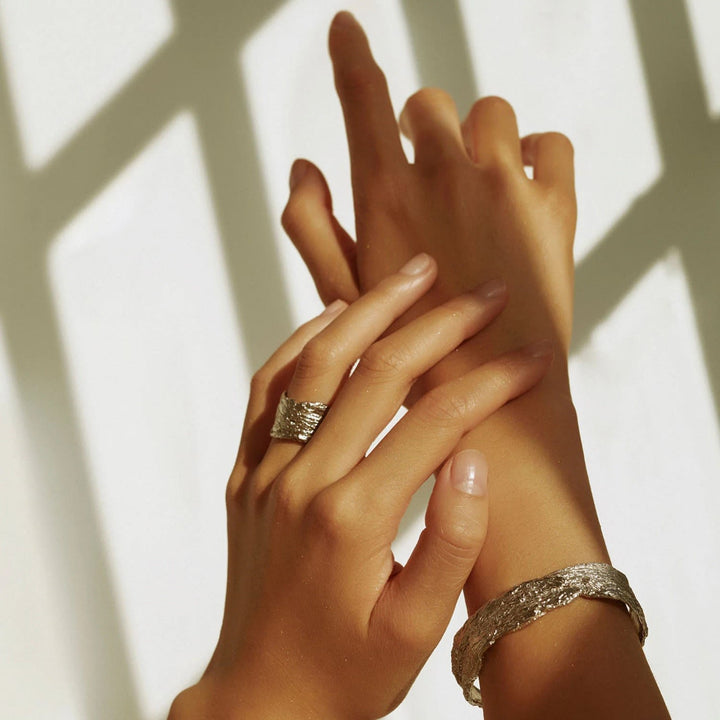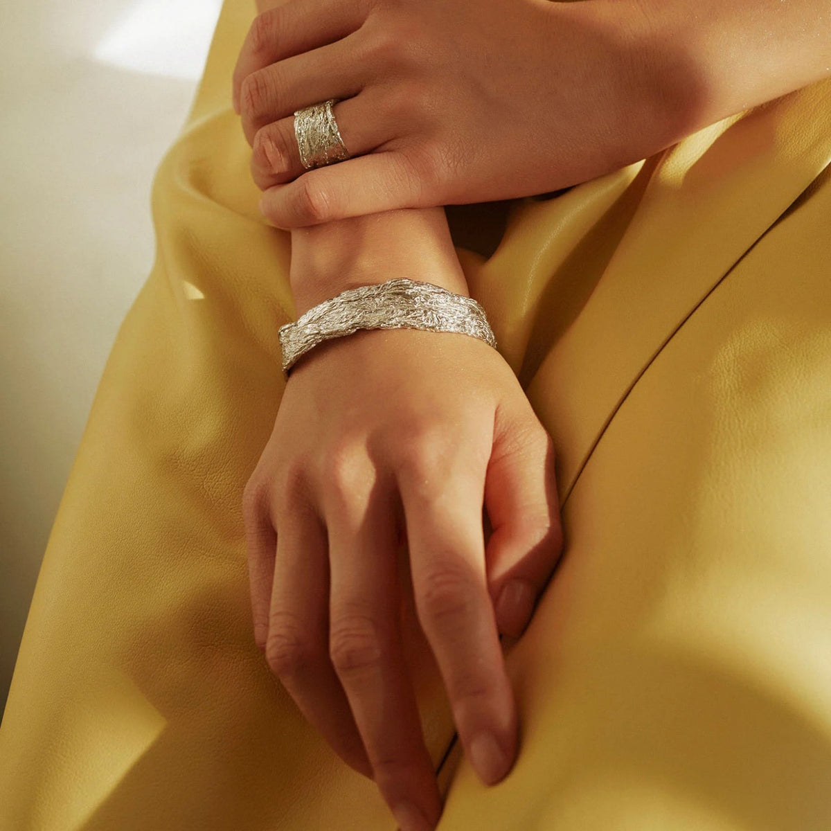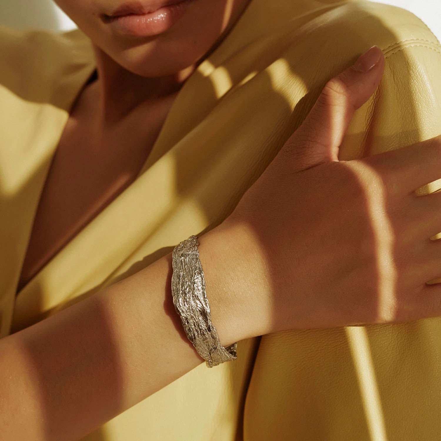 The Archaic Bracelet Silver by Eva Remenyi is a cuff bracelet with a rough, grooved surface and organic lines. Simple enough for everyday wear, this rhodium-plated recycled silver cuff has an adjustable opening to fit a variety of wrist sizes.