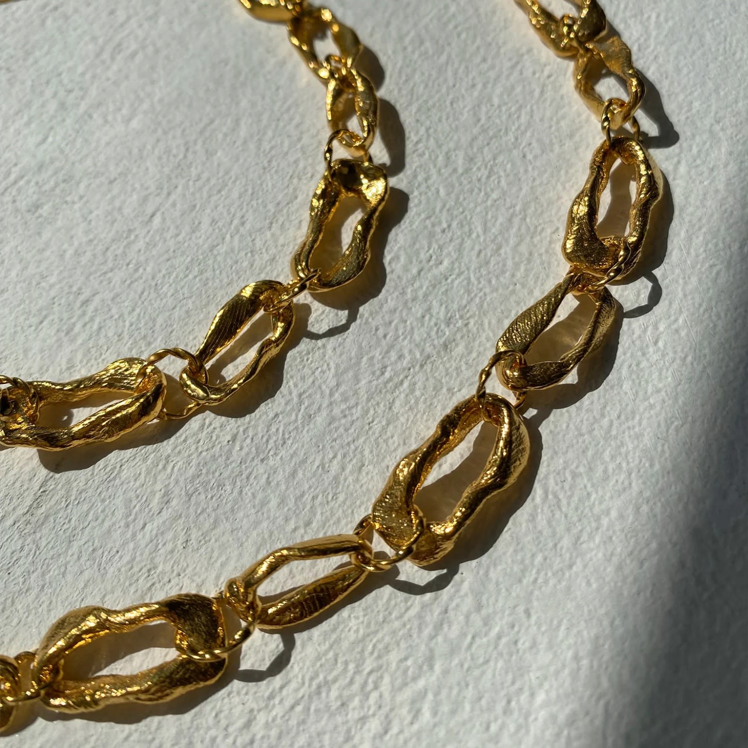 This chain necklace is made from 24k gold plated brass. It features irregular, handmade links and has an adjustable length.