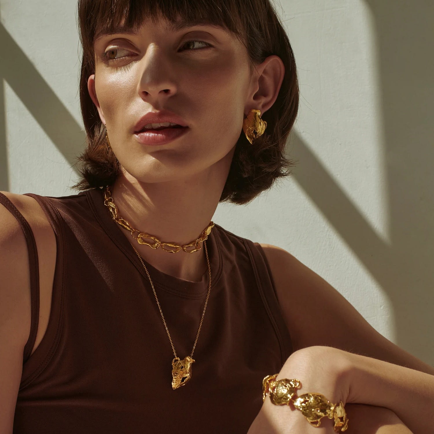 This Vacation Chain Choker Necklace by Eva Remenyi embodies timeless elegance. Inspired by a weathered amphora, this choker features a handmade chain with irregular links and an organic surface, giving it a unique, rustic charm. Crafted from 24k gold plated brass, this deceptively simple necklace is perfect for adding a touch of sophisticated flair to your summer style.