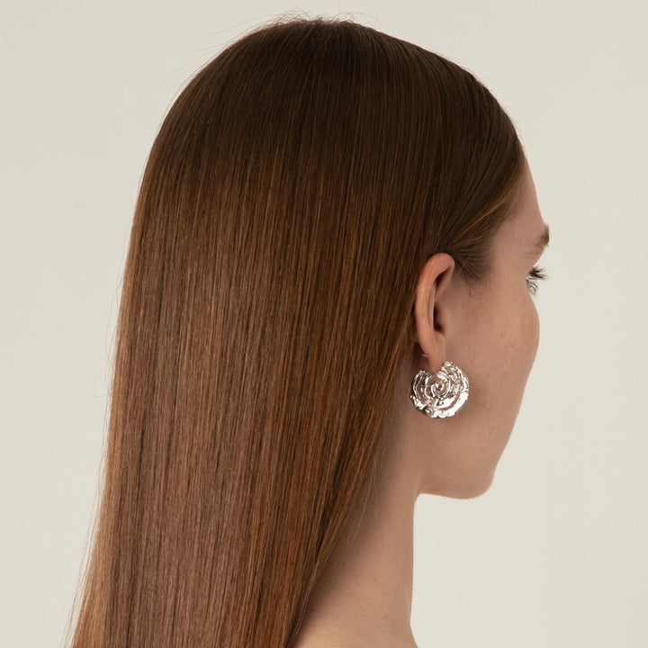 These Origin Earrings Silver by Eva Remenyi are a striking blend of a timeless spiral motif and modern elegance. Their unique design follows the natural curve of the ear and evokes the enduring beauty of folk art. Crafted from recycled sterling silver and rhodium plated, these earrings are eye-catching on their own and can be paired with other pieces for a stunning effect.