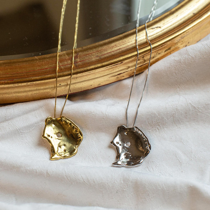 The Talisman Moon Necklace Gold by Eva Remenyi is a perfect everyday piece from the Talisman collection. It is designed to provide a sense of protection and good fortune. Crafted from 24ct gold plated brass, the unique surface is reminiscent of a lunar landscape, making it a stylish and meaningful accessory.