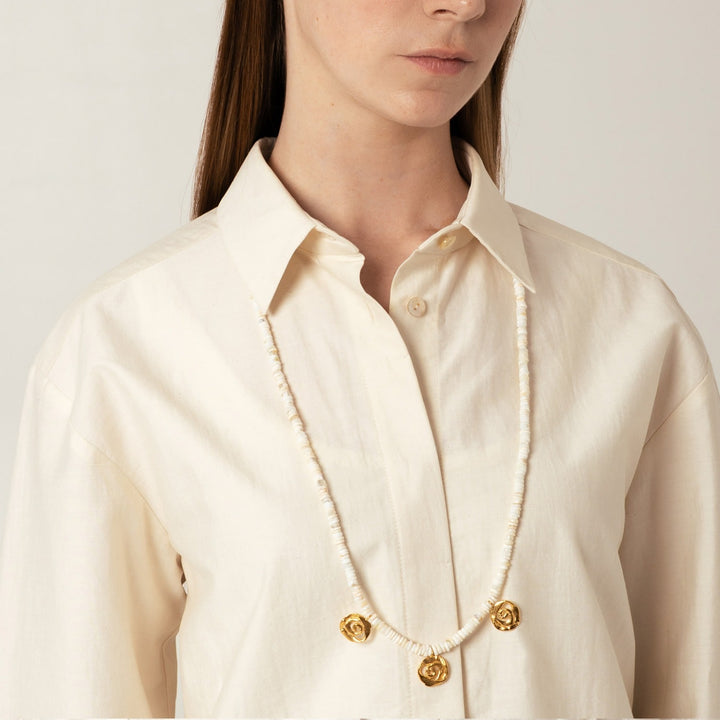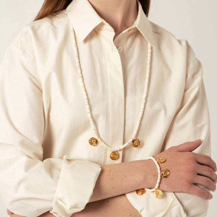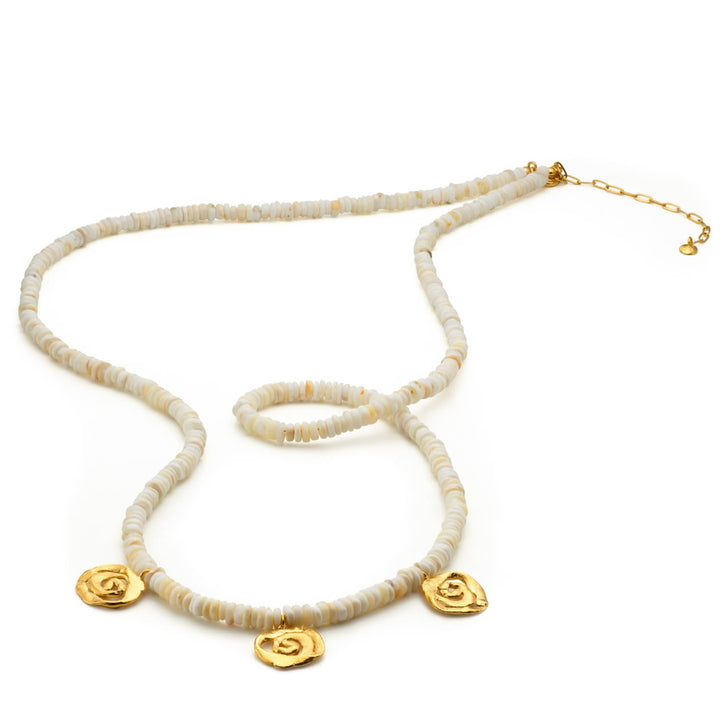This beaded necklace is handcrafted from 1 micron 24 karat gold plated brass and opal beads. It is nickel-free.