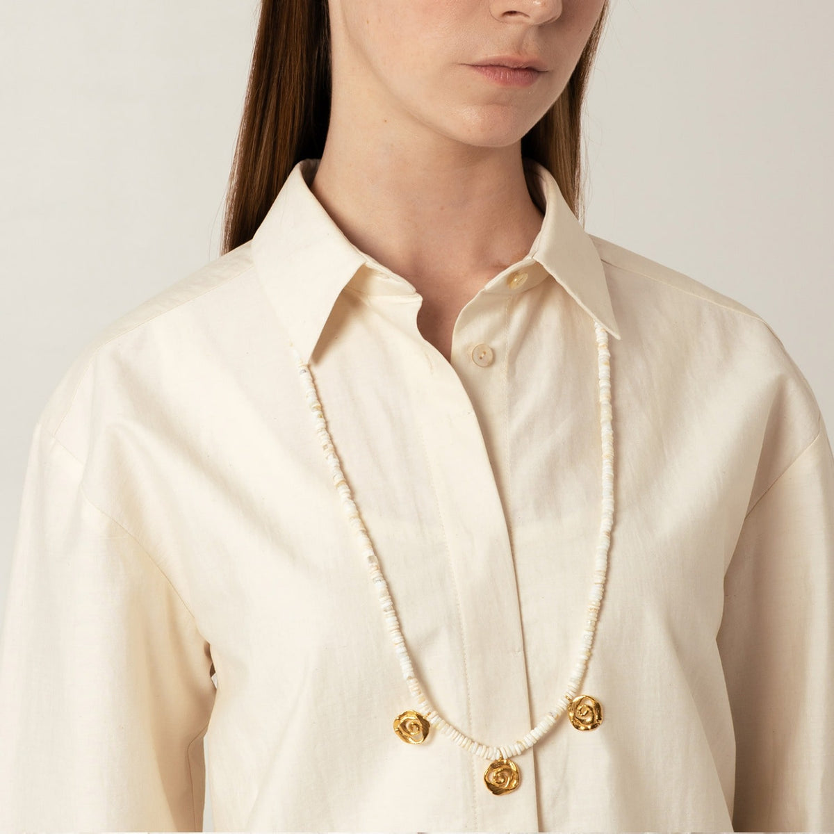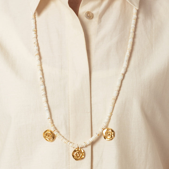 The Origin Opal Necklace Gold by Eva Remenyi is a limited edition statement piece. The delicate opal beads and golden spiral elements create a pleasant harmony, radiating natural femininity and summer freedom. This lightweight necklace is a unique piece that brings individuality and character to any outfit, especially against sun-kissed skin.