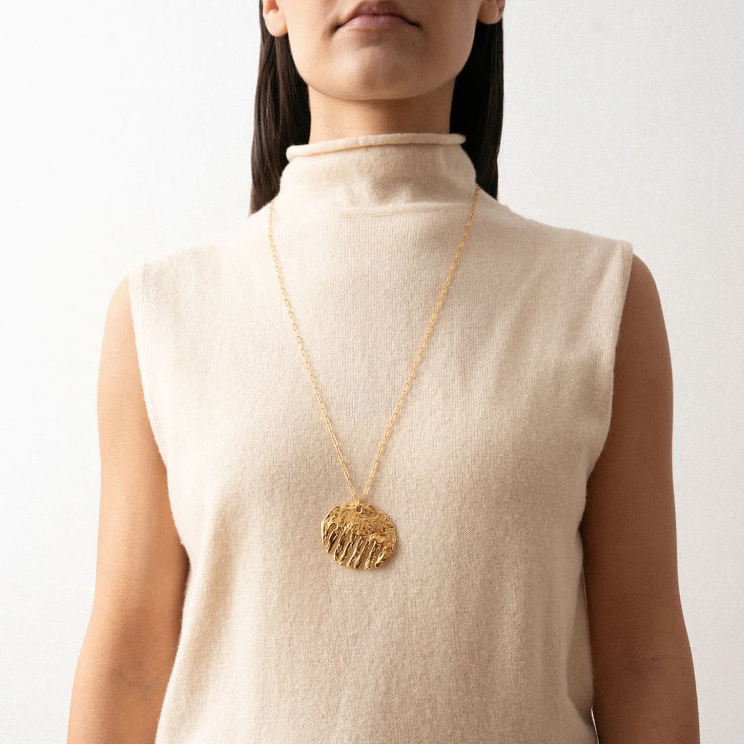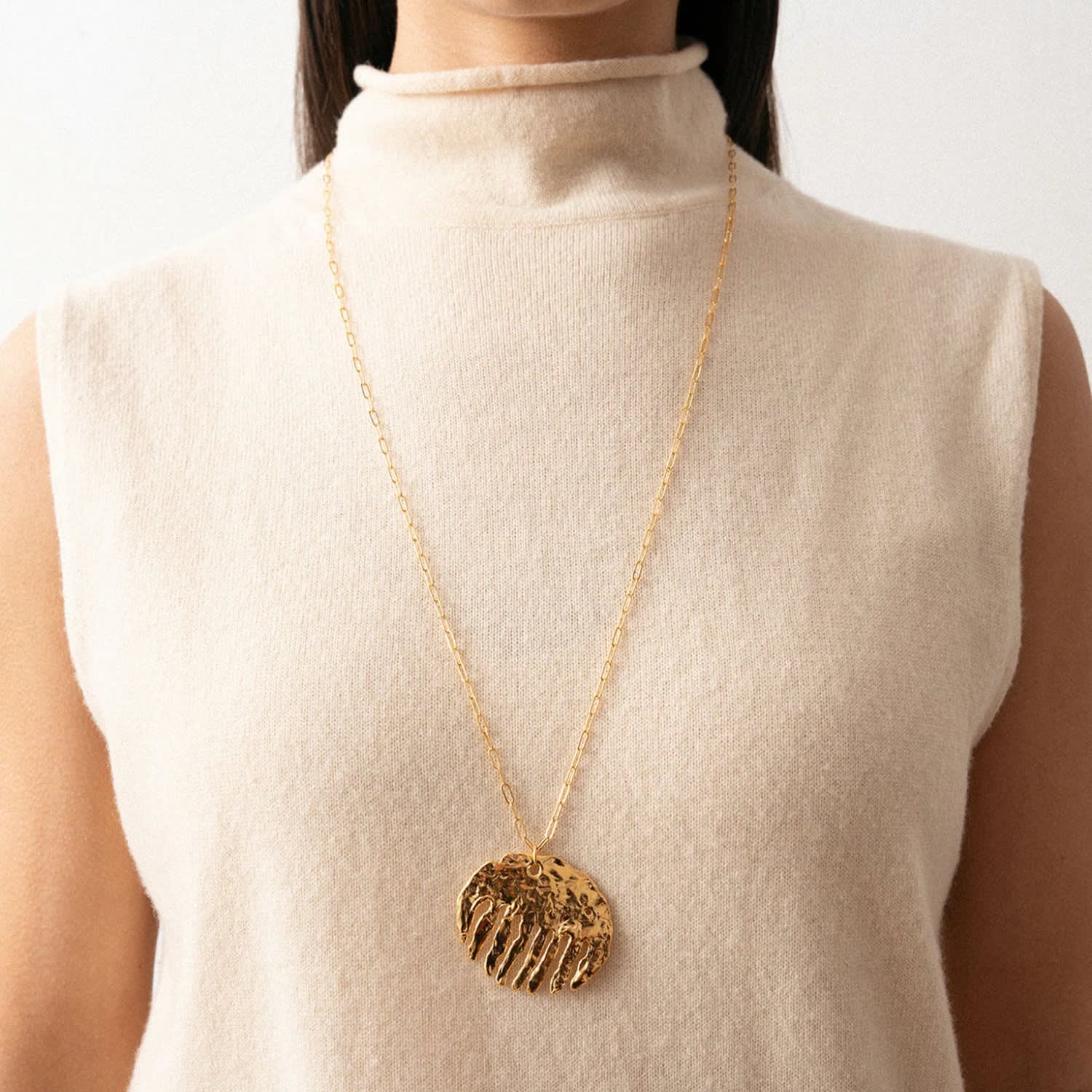 This pendant necklace is made of 1 micron 24 karat gold plated brass and is nickel-free. It is also available in rhodium plated sterling silver.