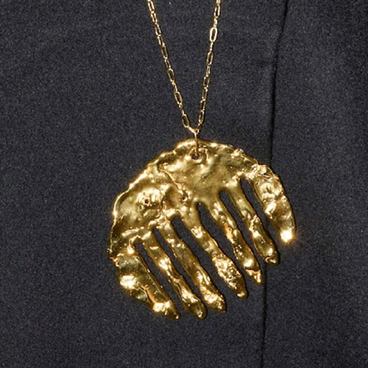 The Simon Radvan X Eva Remenyi Comb Necklace Gold by Eva Remenyi is a stunning statement necklace with a unique, organic shape and minimalist design. This piece, created as part of a collaboration, is a handcrafted accessory that enhances any outfit and adds a unique style and character to the wearer. It is available in rhodium plated sterling silver as well.
