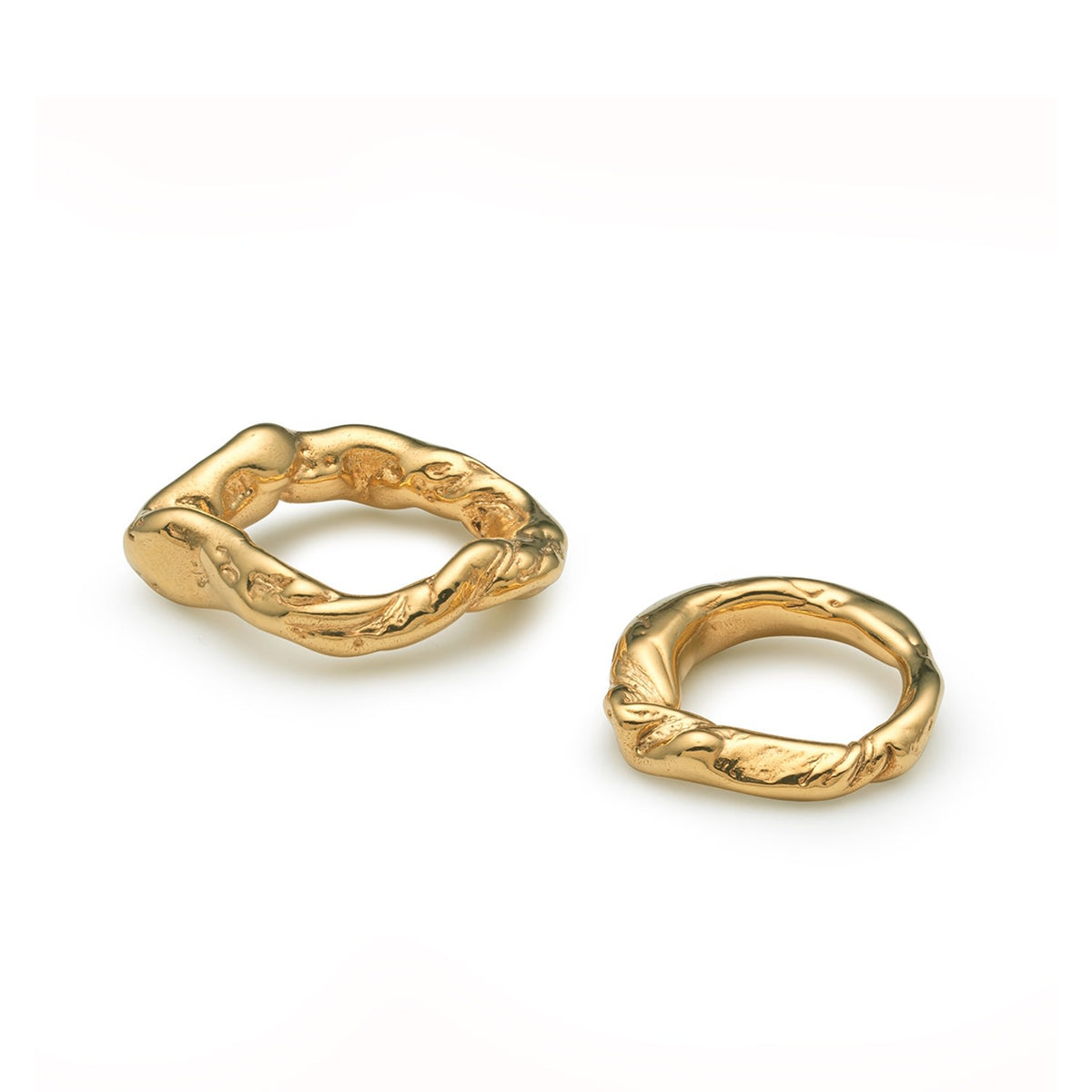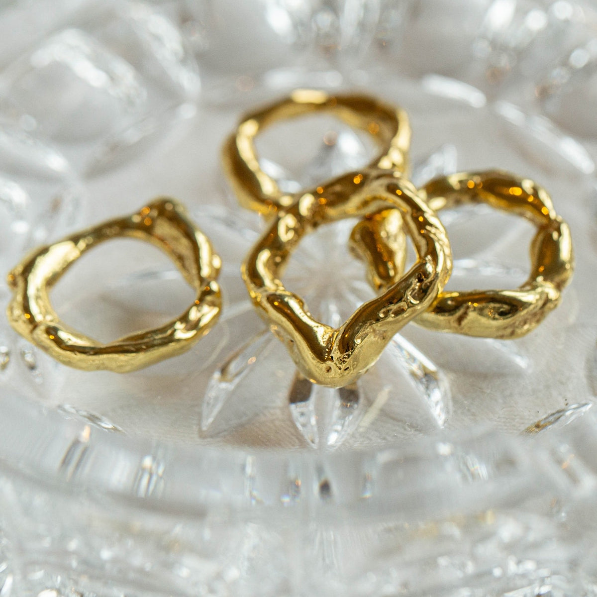This chunky ring is made of 24 carat gold-plated brass. It has a chunky band and a lunar landscape-like surface. It is also available in silver.