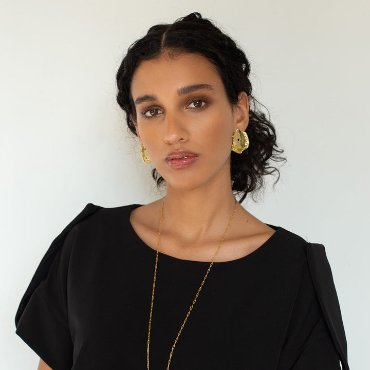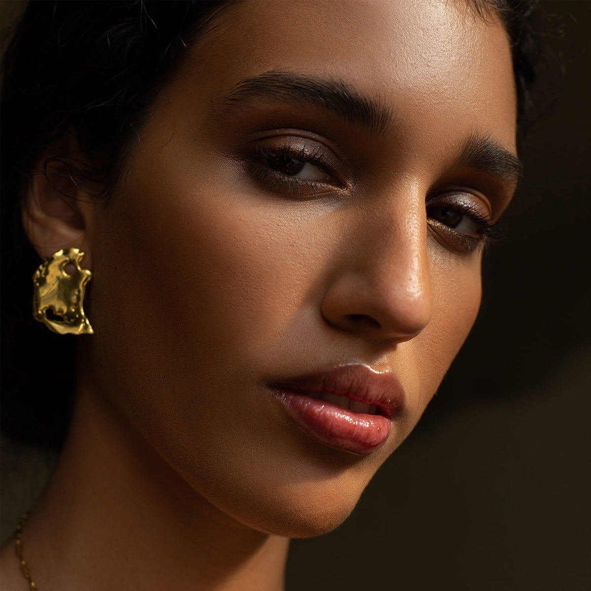 The Talisman Moon Earrings Gold by Eva Remenyi are unique and stylish. These stud earrings are handmade in Budapest and are crafted from 24ct gold plated brass. They feature a moon design in different sizes, embracing deliberate imperfections to add interest and character.