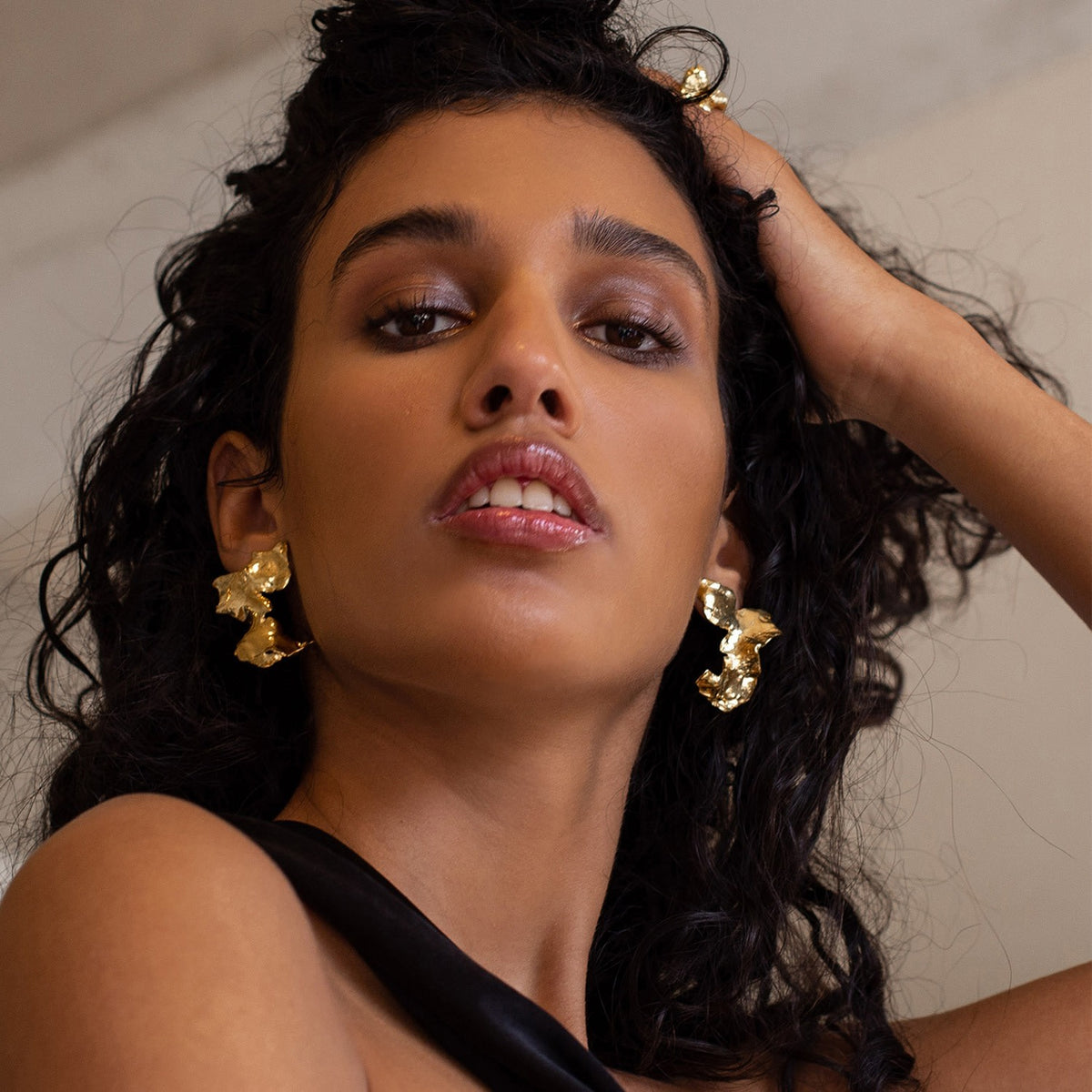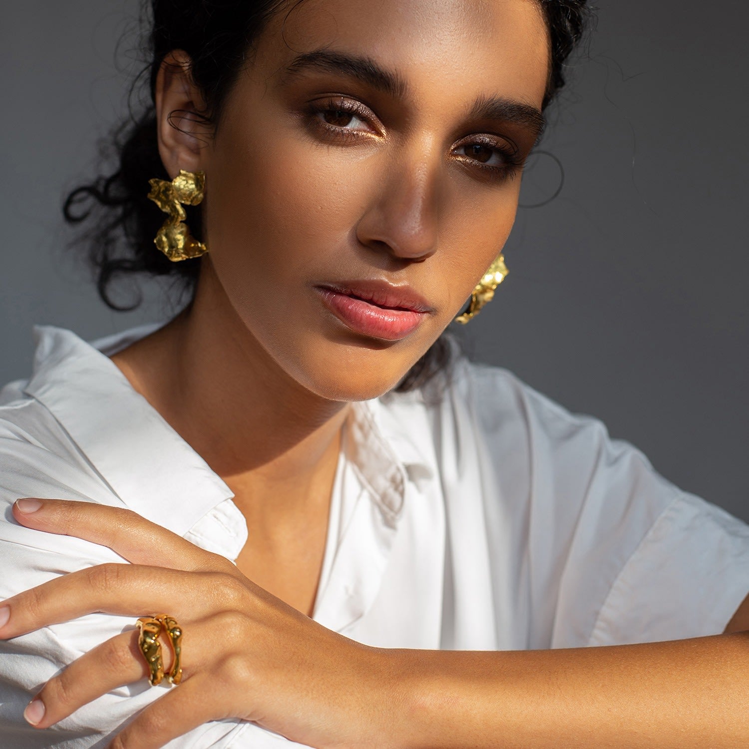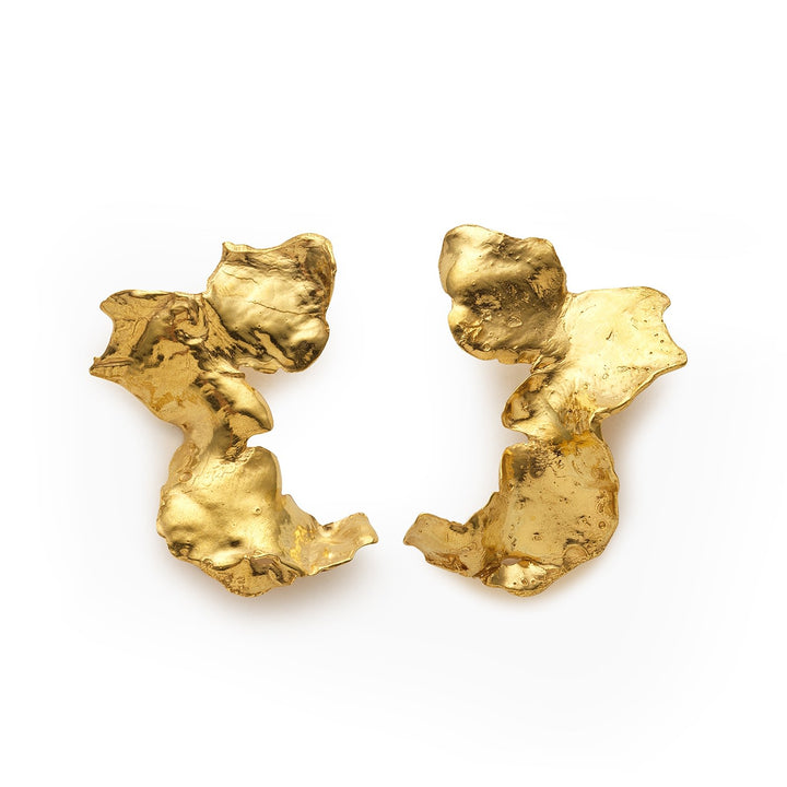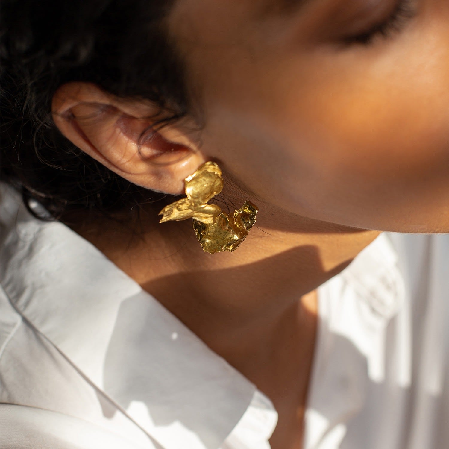 These Talisman Flow Earrings by Eva Remenyi are a bold yet elegant statement piece. Each piece from the Talisman collection carries a sense of protection and good fortune. The earrings are handmade with deliberate imperfections, featuring intentional faults and a surface reminiscent of a lunar landscape, celebrating the beauty of authenticity and a unique, artistic spirit.