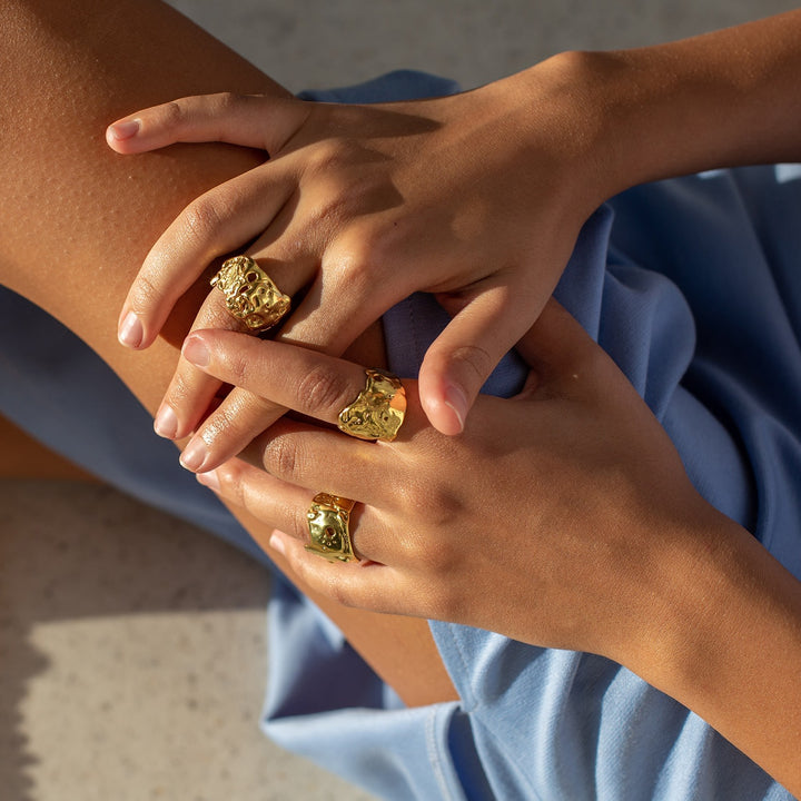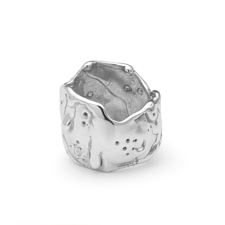 This Talisman Moon Ring by Eva Remenyi is a chunky, impactful piece that adds a modern touch to your look. Part of a collection that embraces deliberate imperfections, its surface is reminiscent of a lunar landscape. Handcrafted from rhodium-plated recycled silver, this ring carries a unique essence of protection and good fortune.