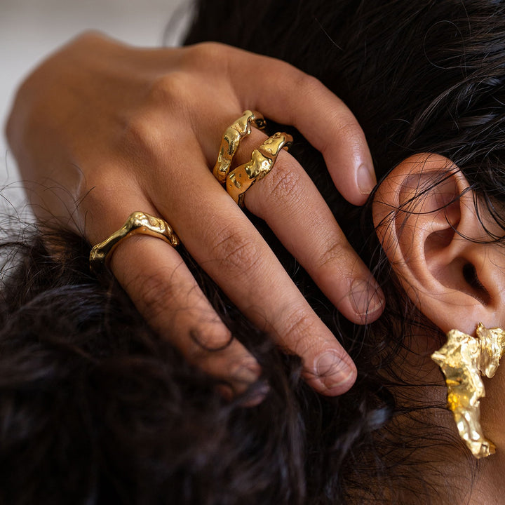 The Talisman Flow Earrings by Eva Remenyi are a bold yet elegant statement accessory. Crafted with meticulous attention to detail, these rhodium-plated recycled sterling silver stud earrings embrace deliberate imperfections, giving them a surface reminiscent of a lunar landscape. They are a unique and artistic piece.