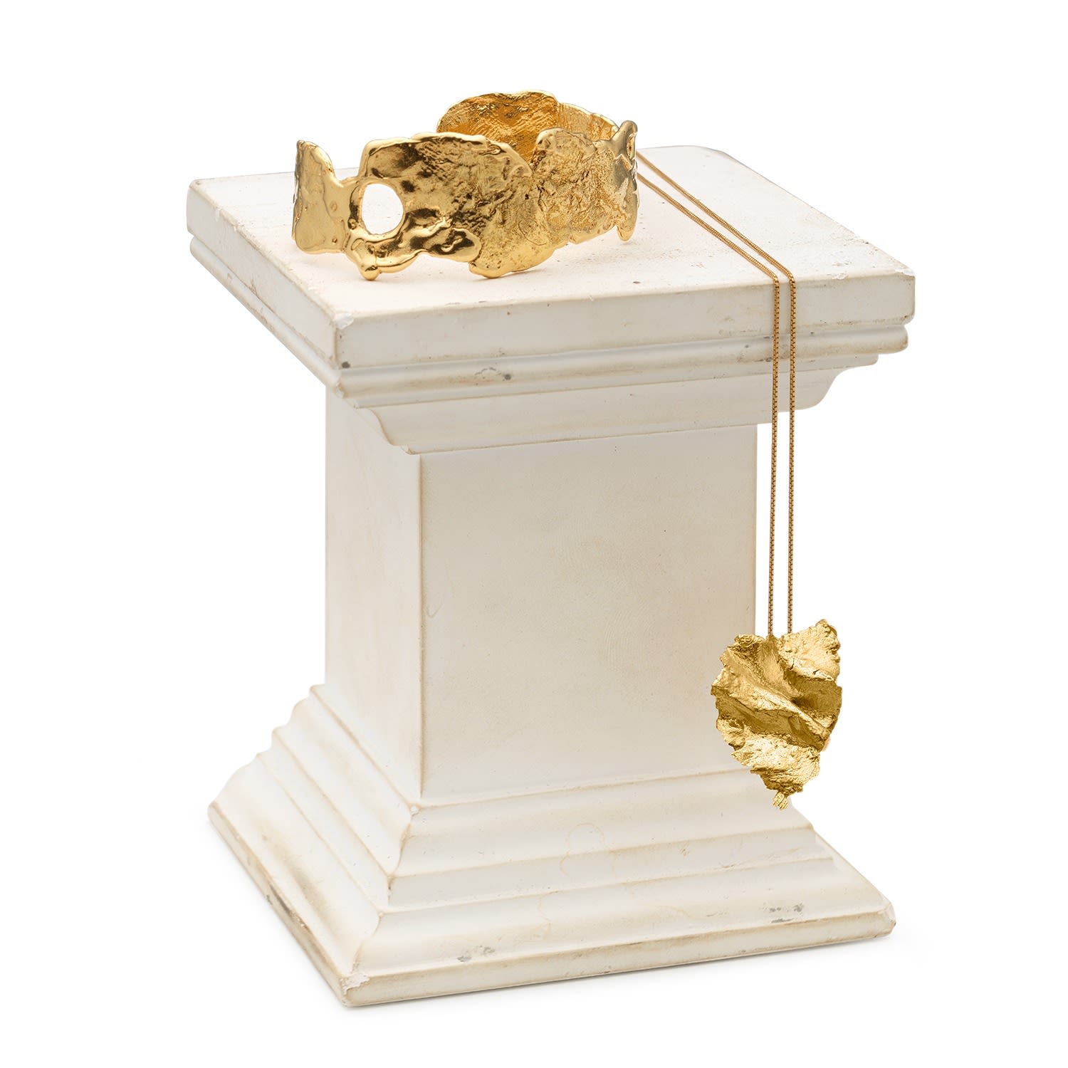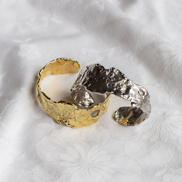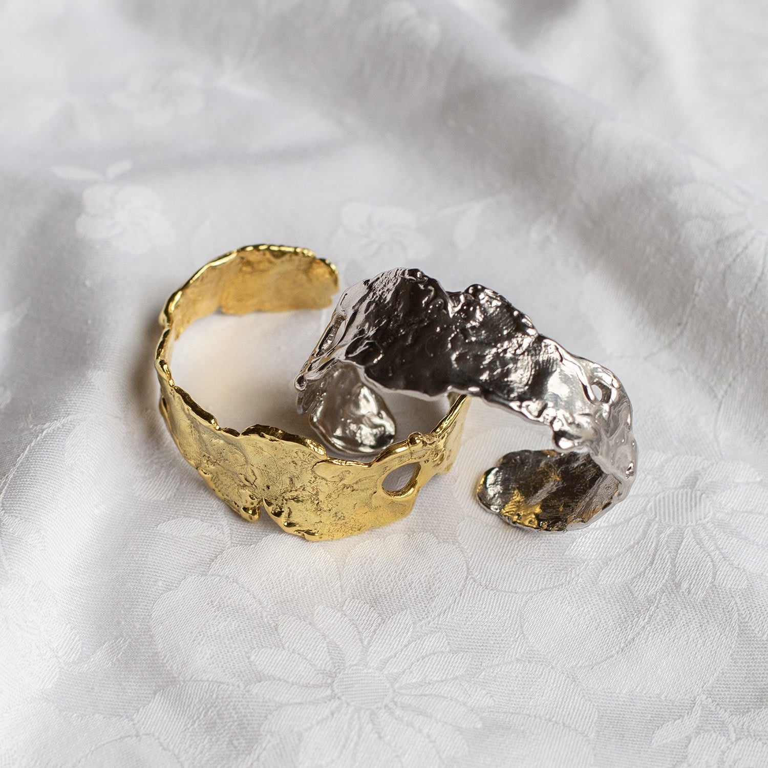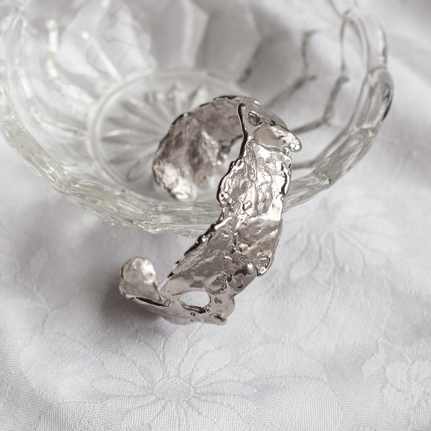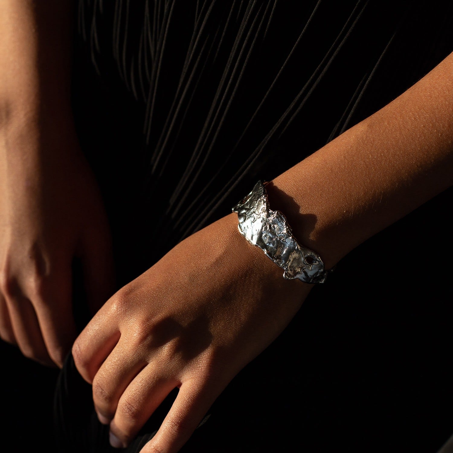 This Talisman Moon Bracelet by Eva Remenyi is a sculptural piece that feels both organic and modern. The deliberate imperfections and lunar-like surface give it a unique essence, symbolizing a sense of protection and good fortune. This chunky, slightly adjustable bracelet is a bold statement piece that looks great on its own or layered with other pieces from the collection.