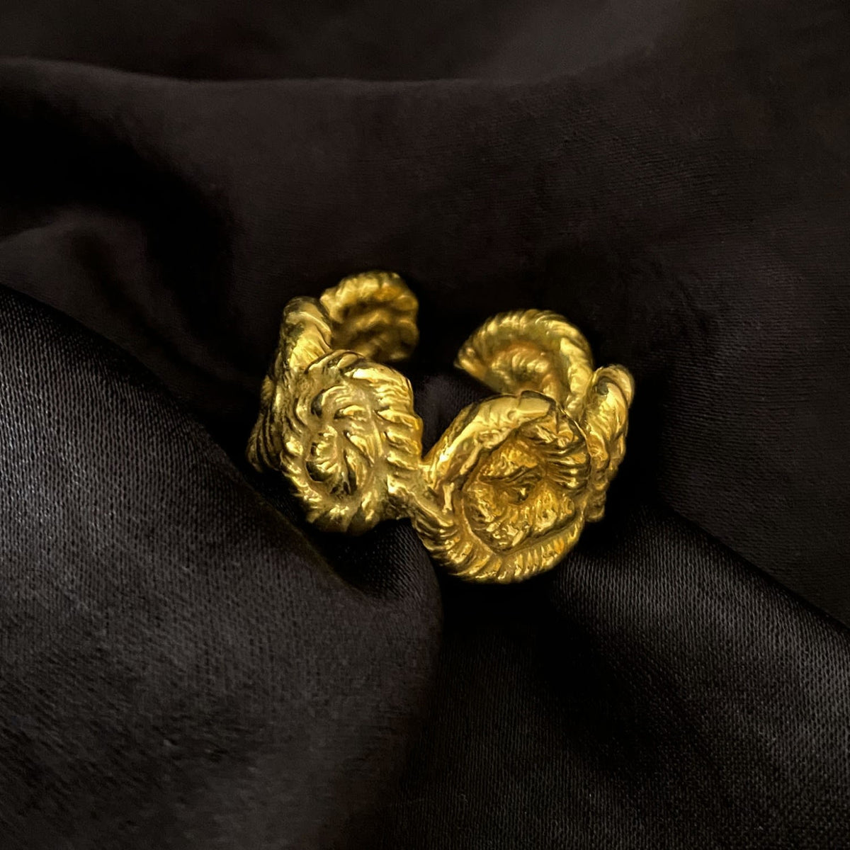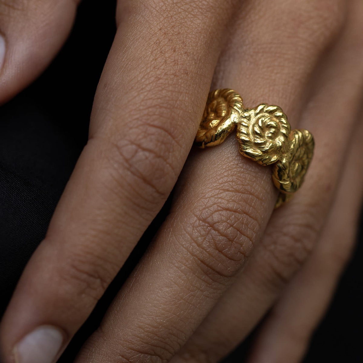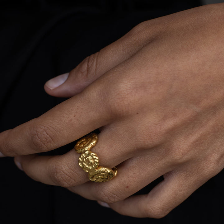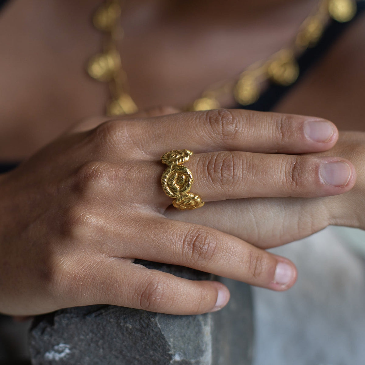 This chunky ring is handmade from 24ct gold-plated brass. The size is slightly adjustable.