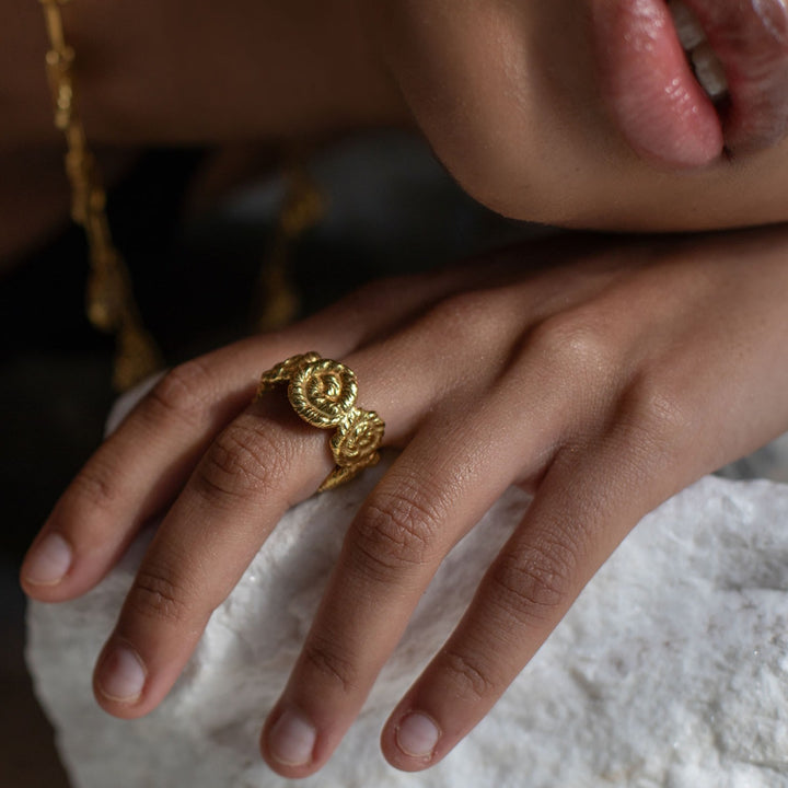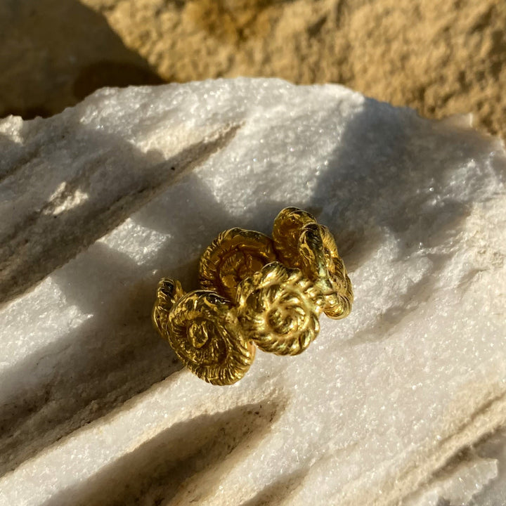 The Nautilus Chunky Ring by Eva Remenyi is a tribute to marine life and environmental awareness. This chunky band ring, handcrafted in Budapest, features the distinctive nautilus shape in 24ct gold-plated brass. With 5% of all Nautilus sales going to The Ocean Cleanup, this ring is a beautiful way to show support for marine conservation.