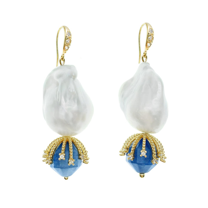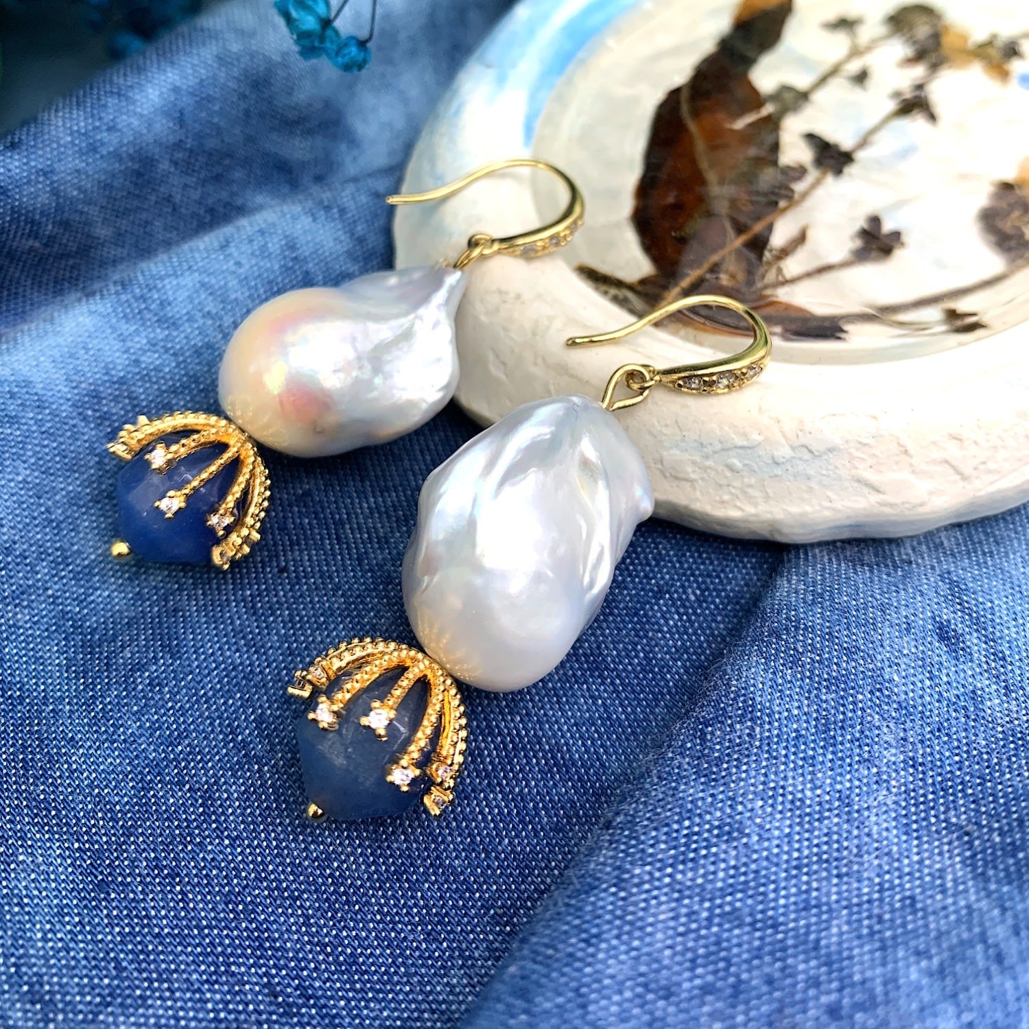 These Baroque Pearl With Lapis Dangle Earrings by Farra are elegant and beautiful. The handmade earrings are made of baroque pearl with Japan golden-plated brass findings. They can be worn for any occasion and look stunning when paired with tied-up hair.