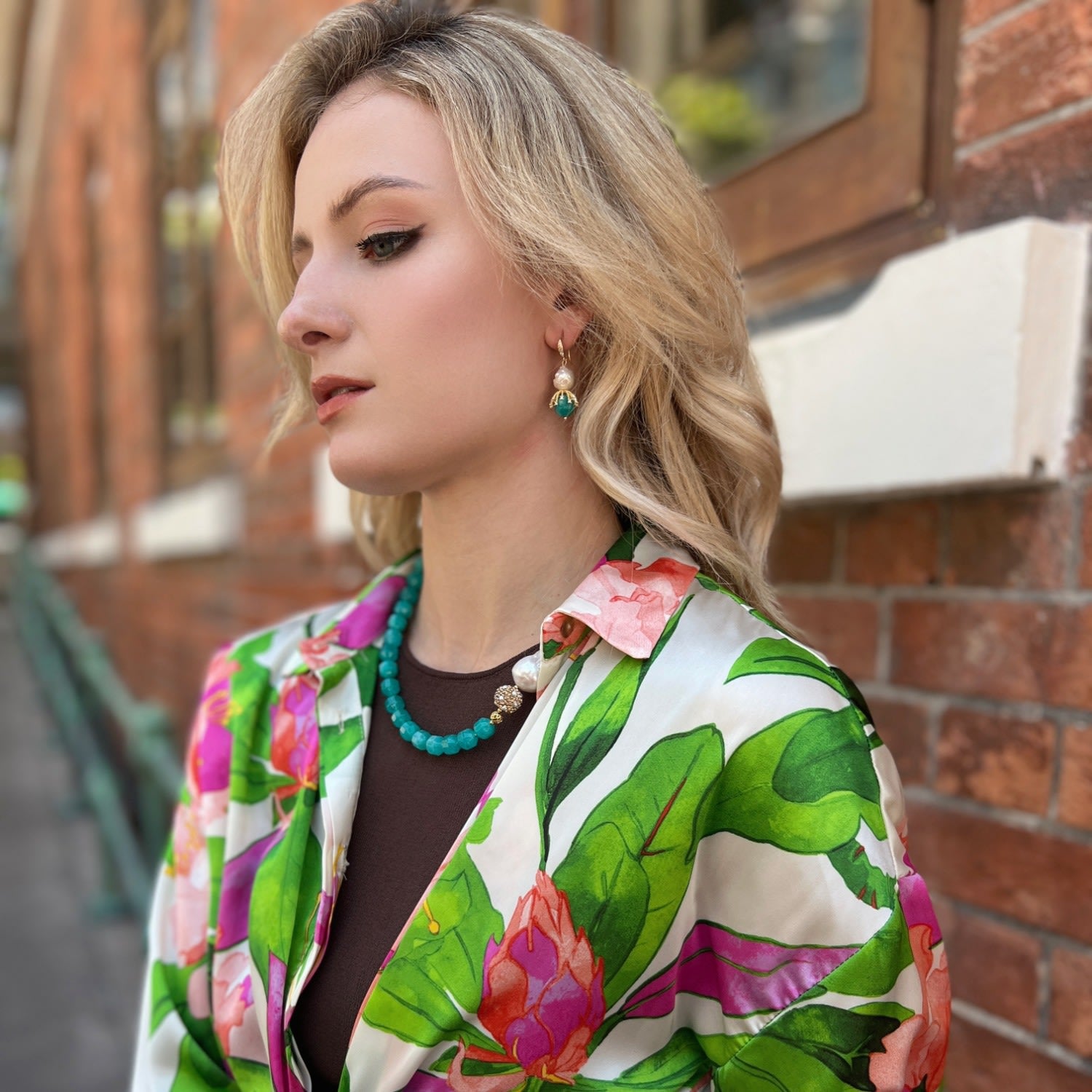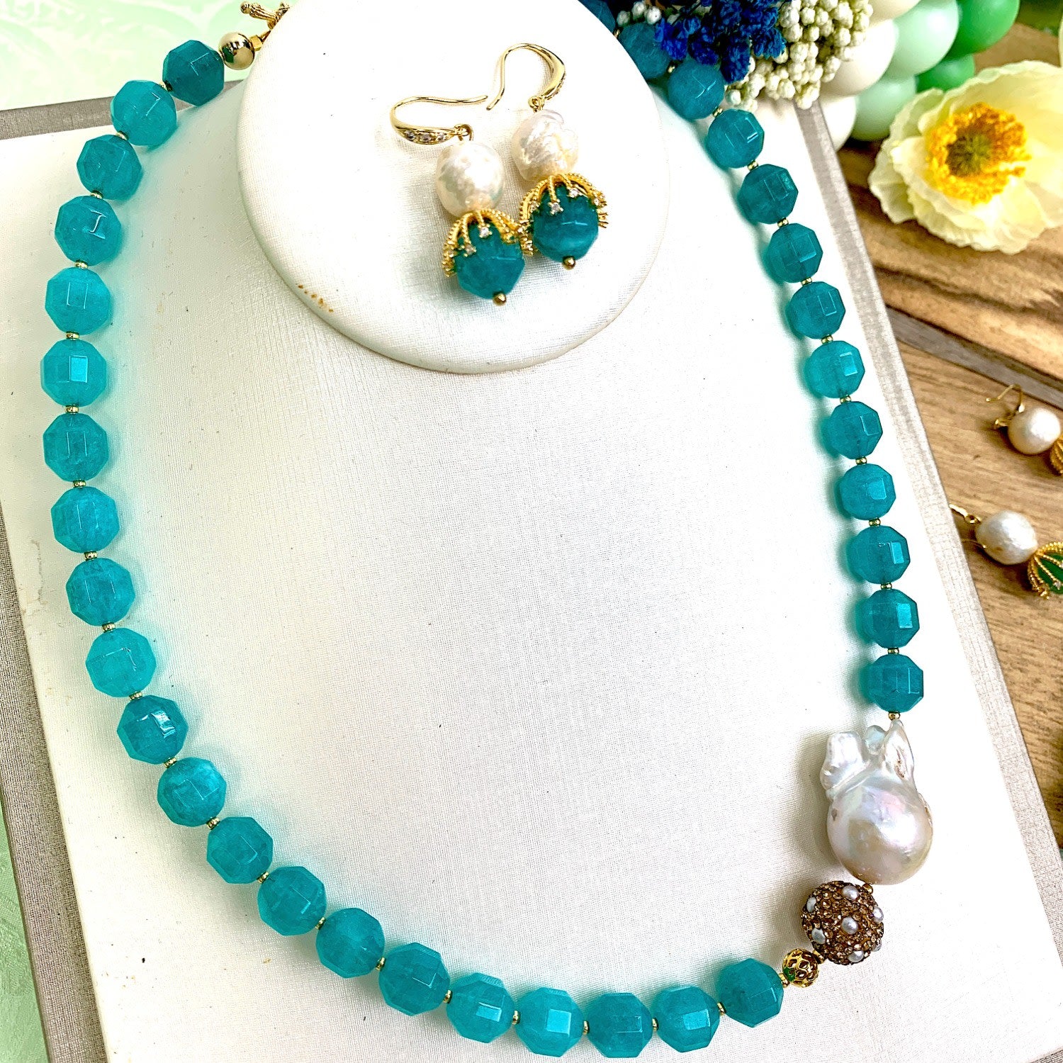 This pearl necklace is handmade from jade with baroque pearl and Japanese golden-plated brass findings.