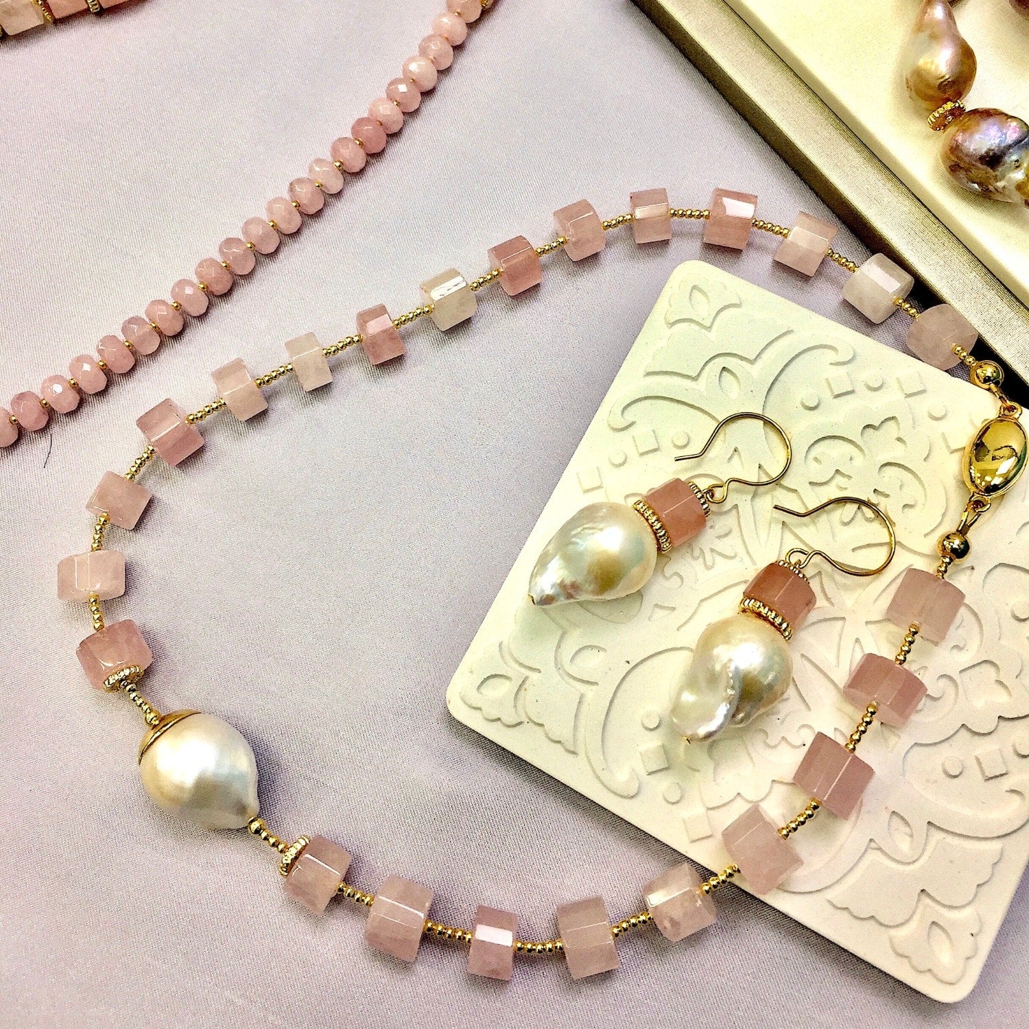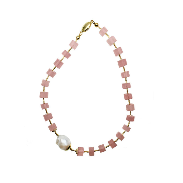 This chain necklace is handmade from rose quartz with baroque and Japan golden-plated brass findings.